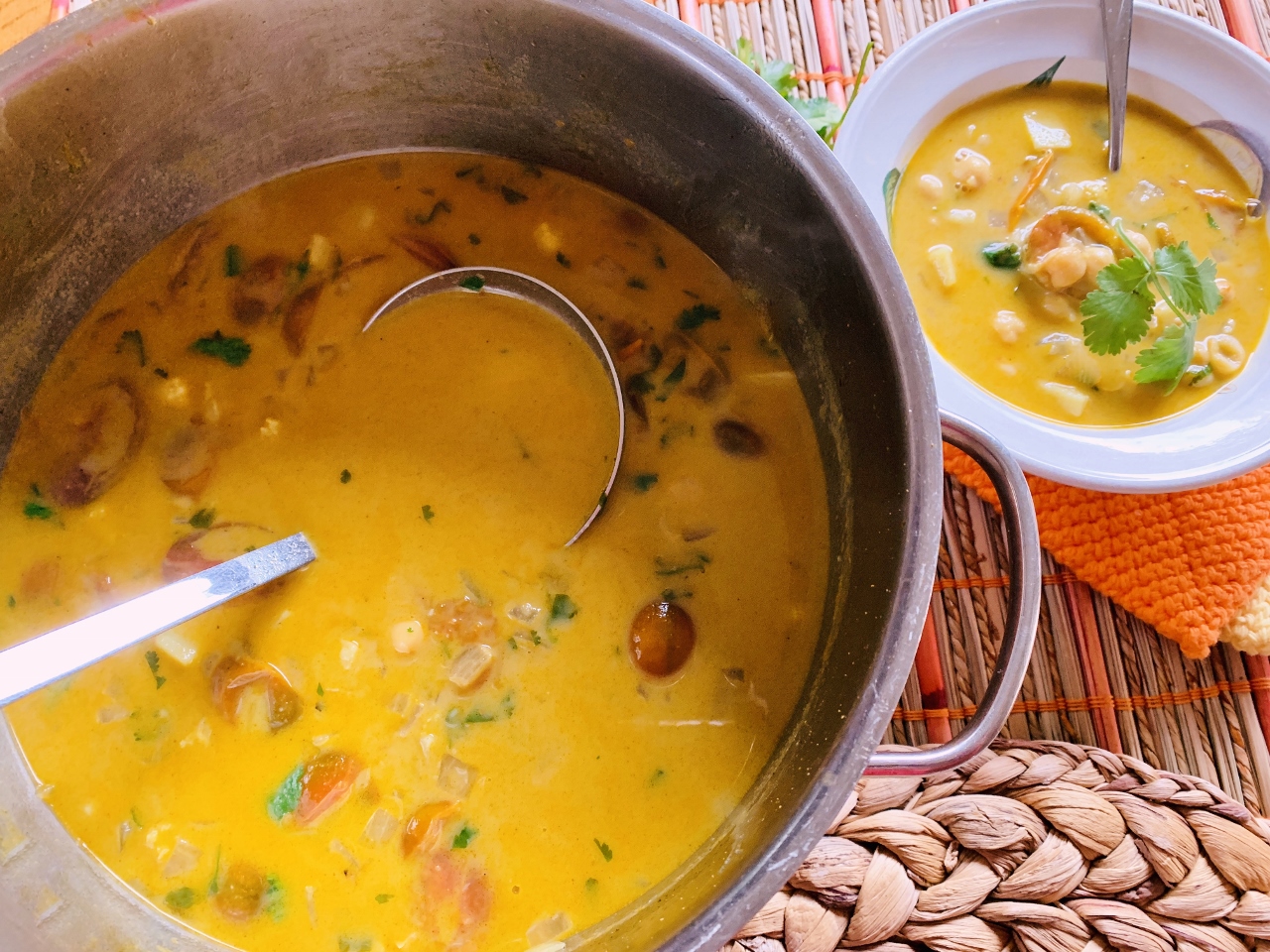 Coconut Curry broth is a simple mix of curry powder and coconut milk, which makes an excellent base in this recipe. I decided to keep it meat-free since I think most of us eat plenty of animal protein and using sweet potatoes, along with chickpeas adds a bit of a sweet contrast with the beans and other ingredients. This recipe makes a big pot of soup and feeds six to eight people – I think it’s great for lunch or dinner served with a side salad, or a slice of seedy bread.
