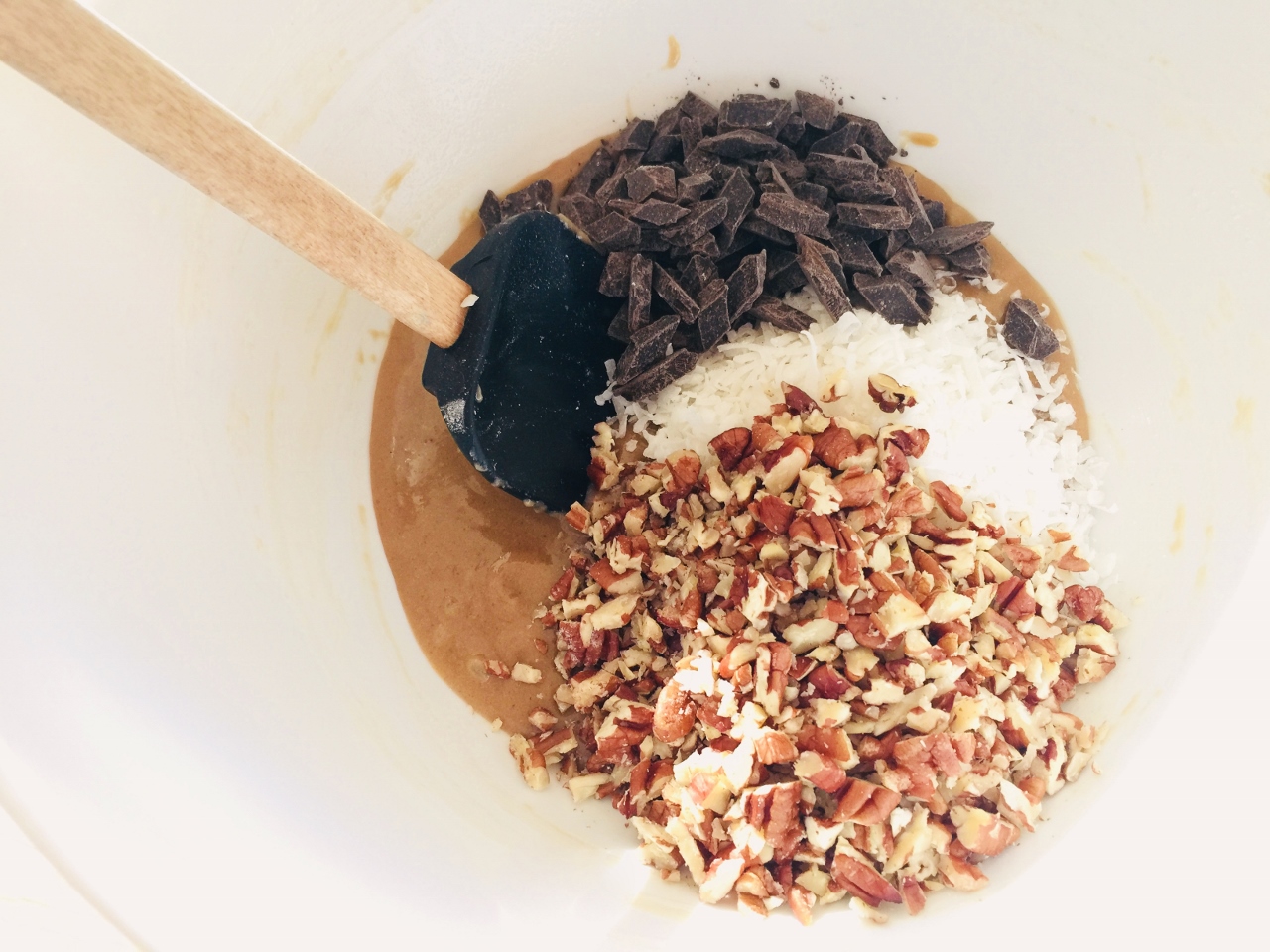 - Add pecans, coconut and chocolate and stir until combined. Pour into greased pan.