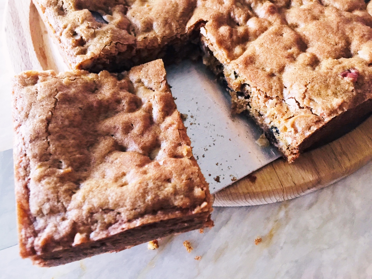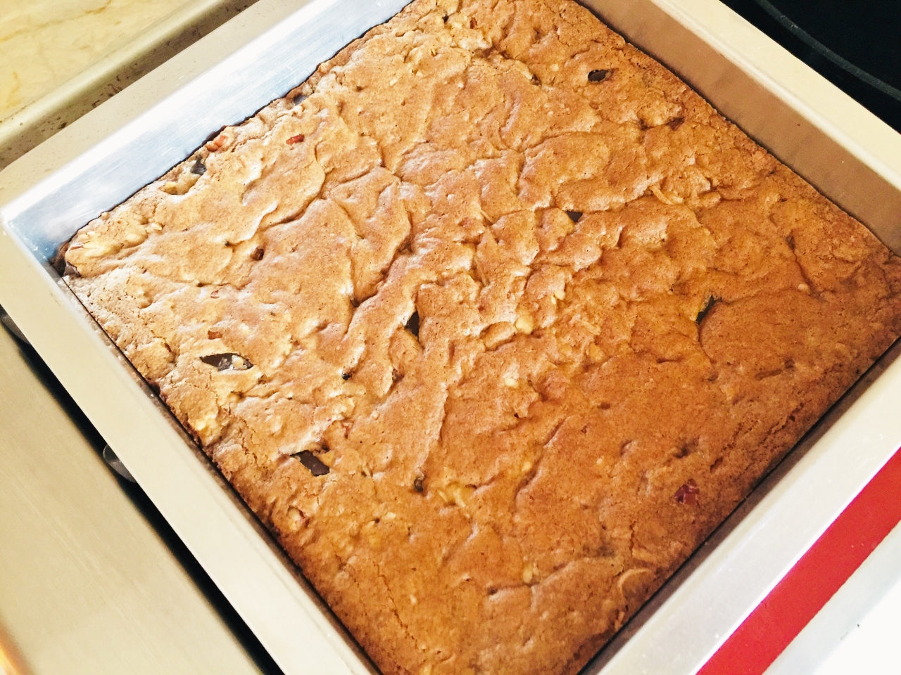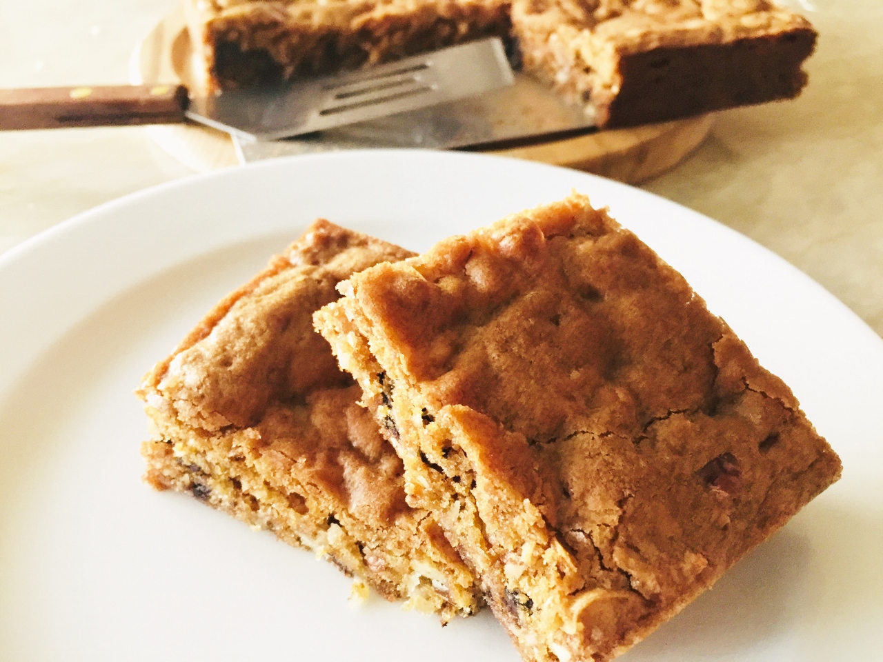 Blondies are a reverse brownie or brownies without cocoa powder. I think blondies are a fantastic dessert because they remind me of eating a cookie, but in a bar format. Baking bar-style cookies are great for several reasons; first they stay fresher longer because they are not a single serving, and second they are easier to make because they bake in the oven in one batch.