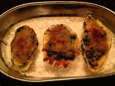 Fresh seafood was offered by the platter but, the cooked oyster selection was even more impressive with Deviled Oysters, Oysters on Horseback and Oysters Rockefeller. Since I am a huge fan of Oysters Rockefeller that was the direction I took. This particular set of oysters were presented with cooked greens and a touch of pernod – no cream – just a light sauce.