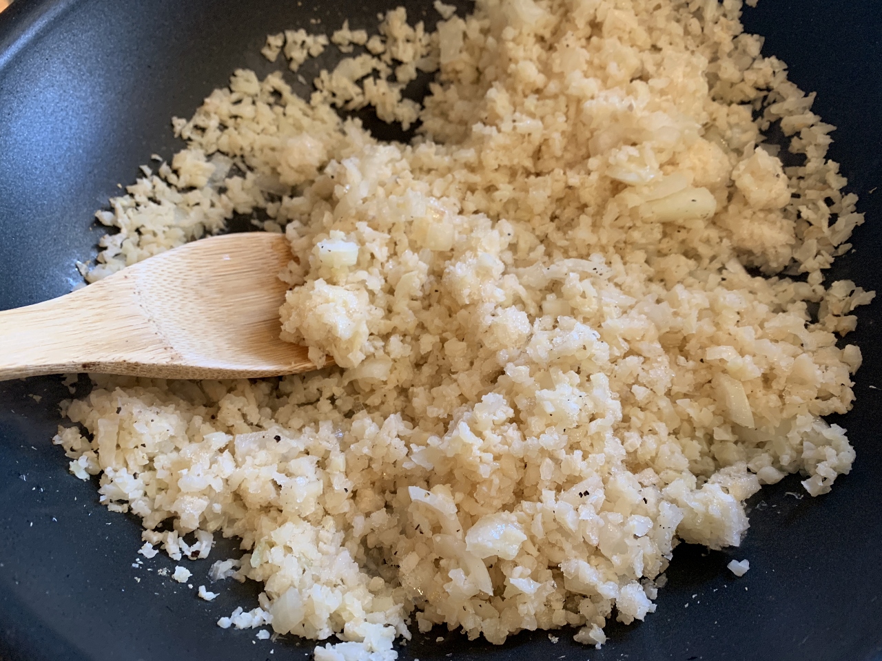- In a large non-stick skillet or wok, add 1 tablespoon oil and place over medium-high heat. Add onion and riced cauliflower, stir. Saute for 6-8 minutes, or until edges of cauliflower just begin to brown.