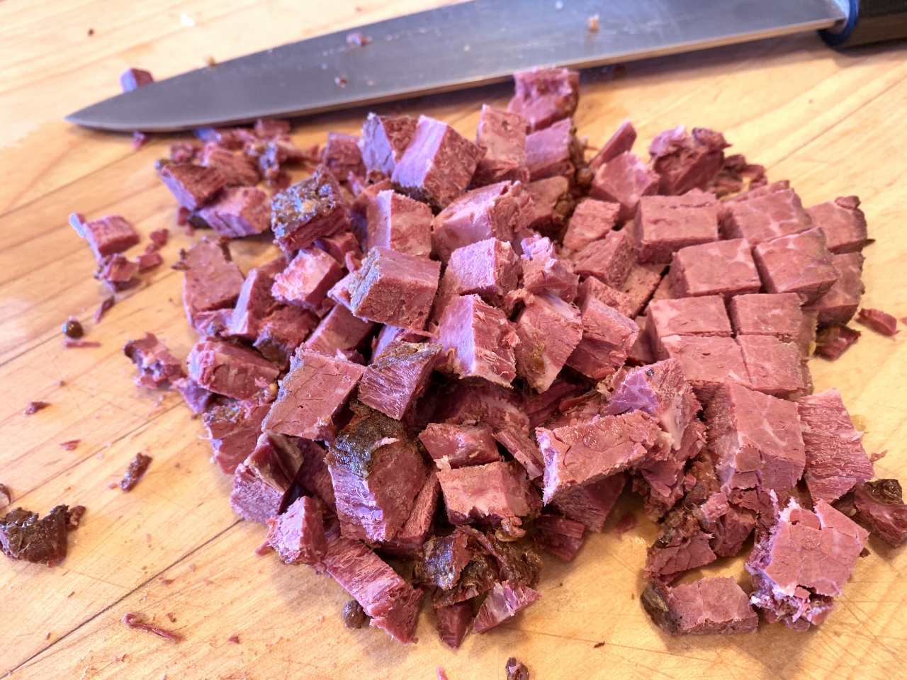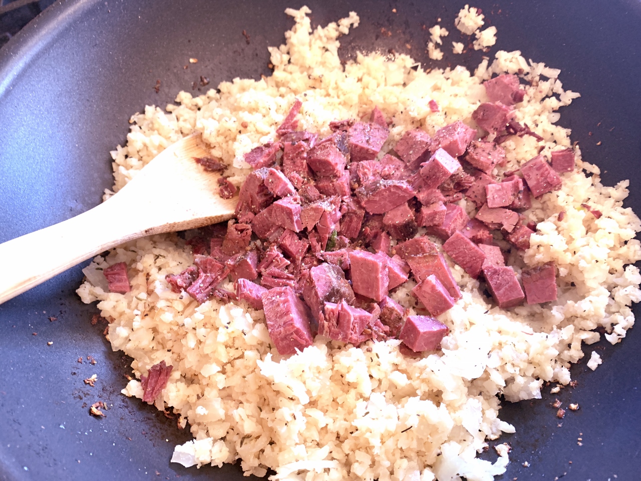 Riced cauliflower can be pulverized beautifully in a food processor, or you can buy it already prepared at the grocery store. Allowing the cauliflower and onion to cook until almost crispy is the key to a good hash and adding the appropriate dried spices doesn’t hurt either. Chunks of corned beef add a nice hardy touch to this dish and a splash of Worcestershire completes it.