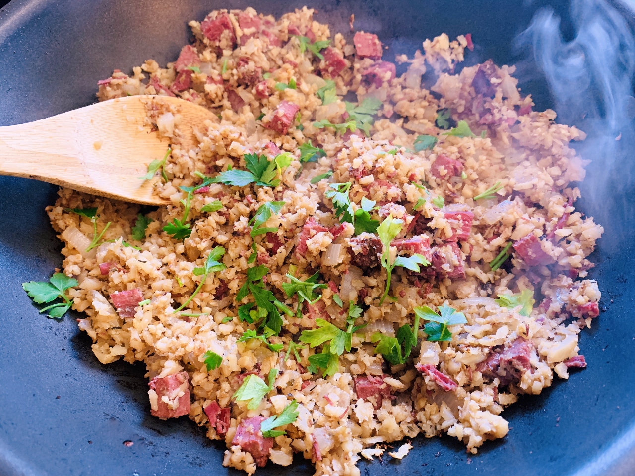 Riced cauliflower can be pulverized beautifully in a food processor, or you can buy it already prepared at the grocery store. Allowing the cauliflower and onion to cook until almost crispy is the key to a good hash and adding the appropriate dried spices doesn’t hurt either. Chunks of corned beef add a nice hardy touch to this dish and a splash of Worcestershire completes it.