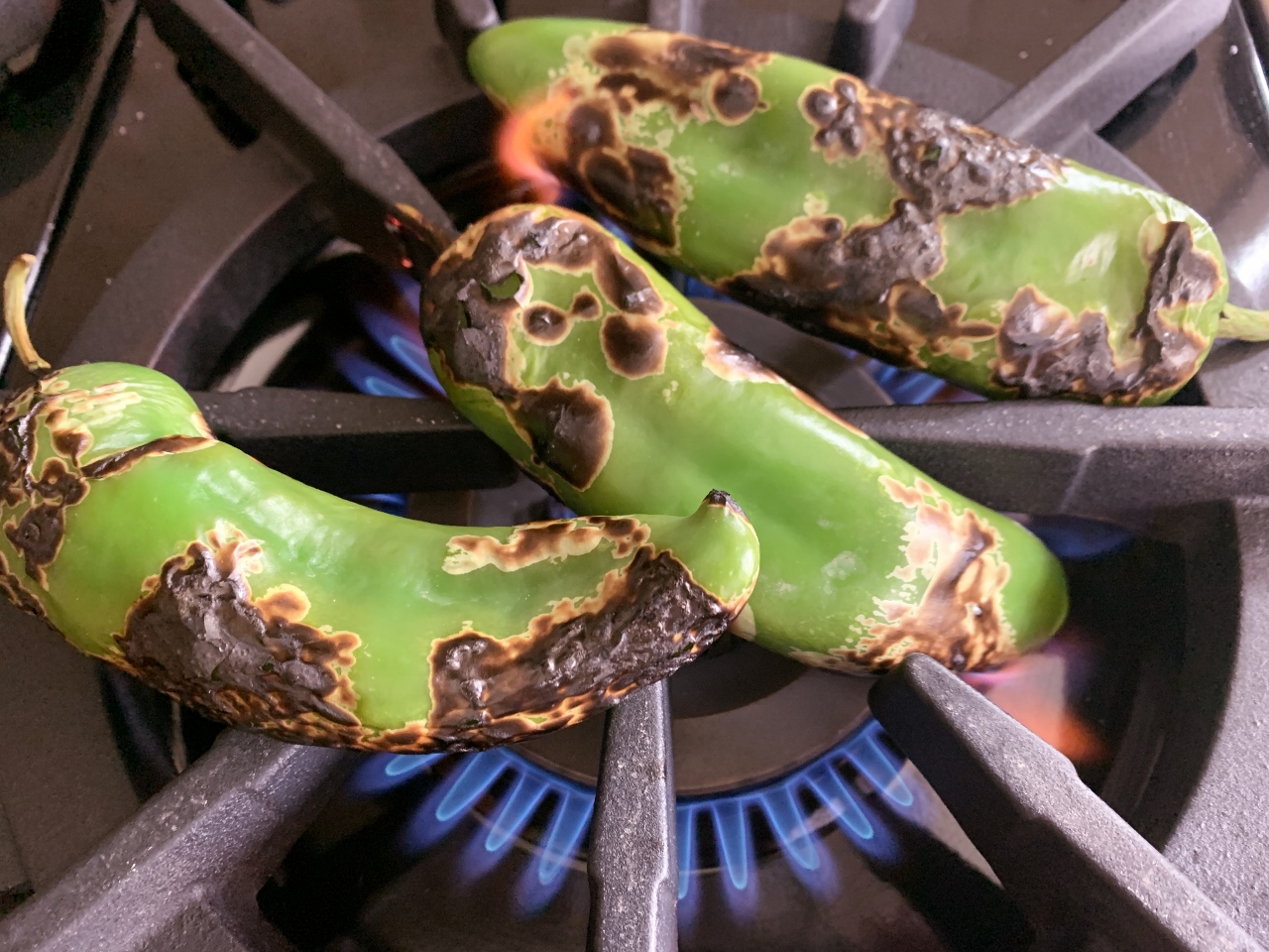 - Over high flame on stove top or broiler, place chilies to char. Remove and place in a bag to steam for 5 minutes. Remove and peel charred skin and seeds from inside. Pull into strips with hands, set aside.