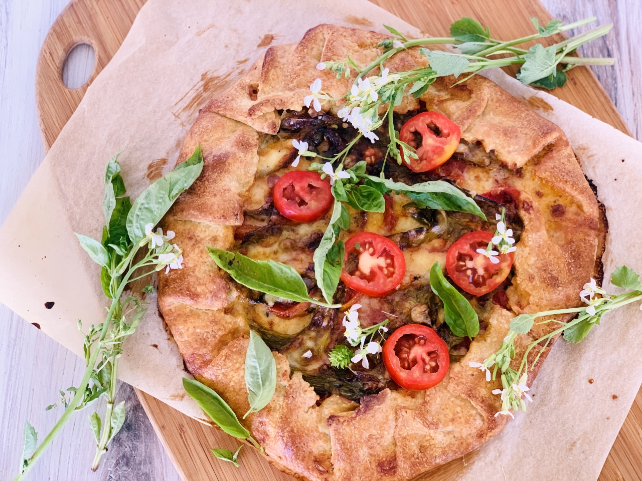 - Remove tart and cool for 20 minutes. Top with fresh herbs and slice. Enjoy!