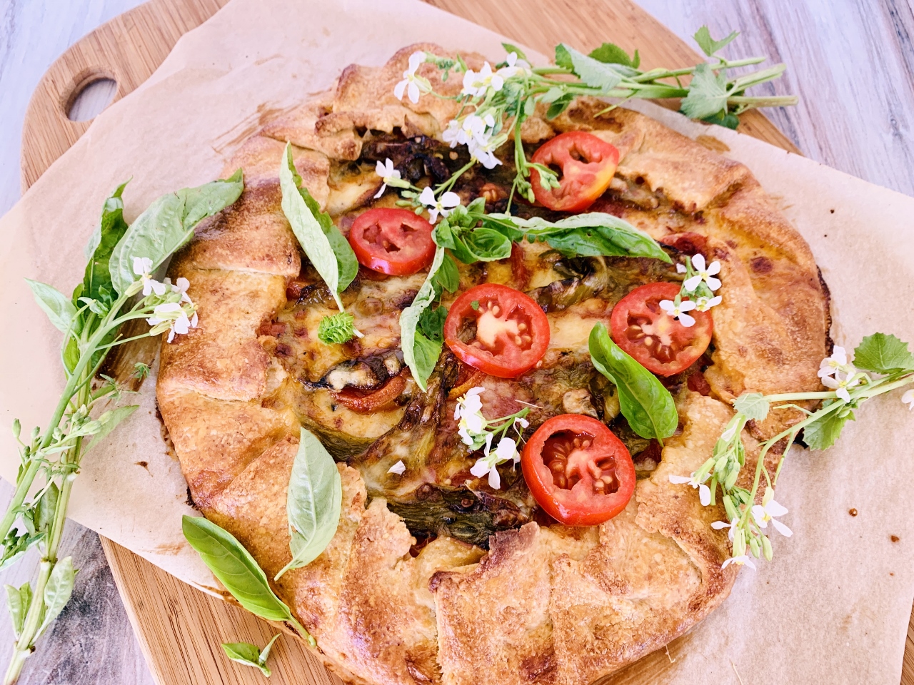 - Fold edges around tomatoes, crimping as you go. Place in freezer for 10 minutes, remove. Brush edges with cream and bake in oven for 20 minutes at 425 degrees, then reduce temperature and bake for 20 minutes at 375 degrees.