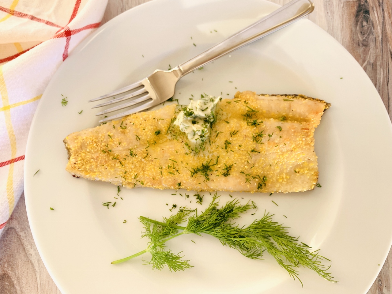 A dusting of cornmeal and flour adds a convenient crunch to a trout filet and a smooth, and creamy dollop of dill butter when it’s warm right out of the pan, makes it taste even better. This meal is made in minutes and tastes like a professional put it together for you, but no, you made it yourself.