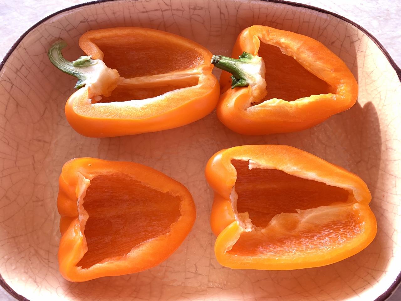 1. Preheat oven to 350 degrees.  Slice peppers in half horizontally and remove seeds.  Place in a greased casserole dish.