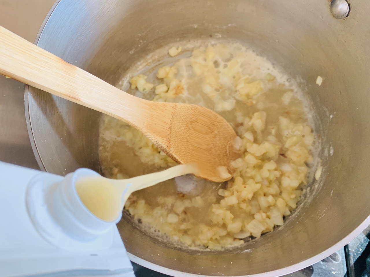 2. Shred chicken, dice onion and mince garlic, set aside.  In a saute pan, add 2 teaspoon oil and place over medium heat.  Add onion and garlic and saute for 2 minutes.  Add flour and stir, continue to cook for 1 minute.  Add broth and stir, cook until thickened about 2 minutes.
