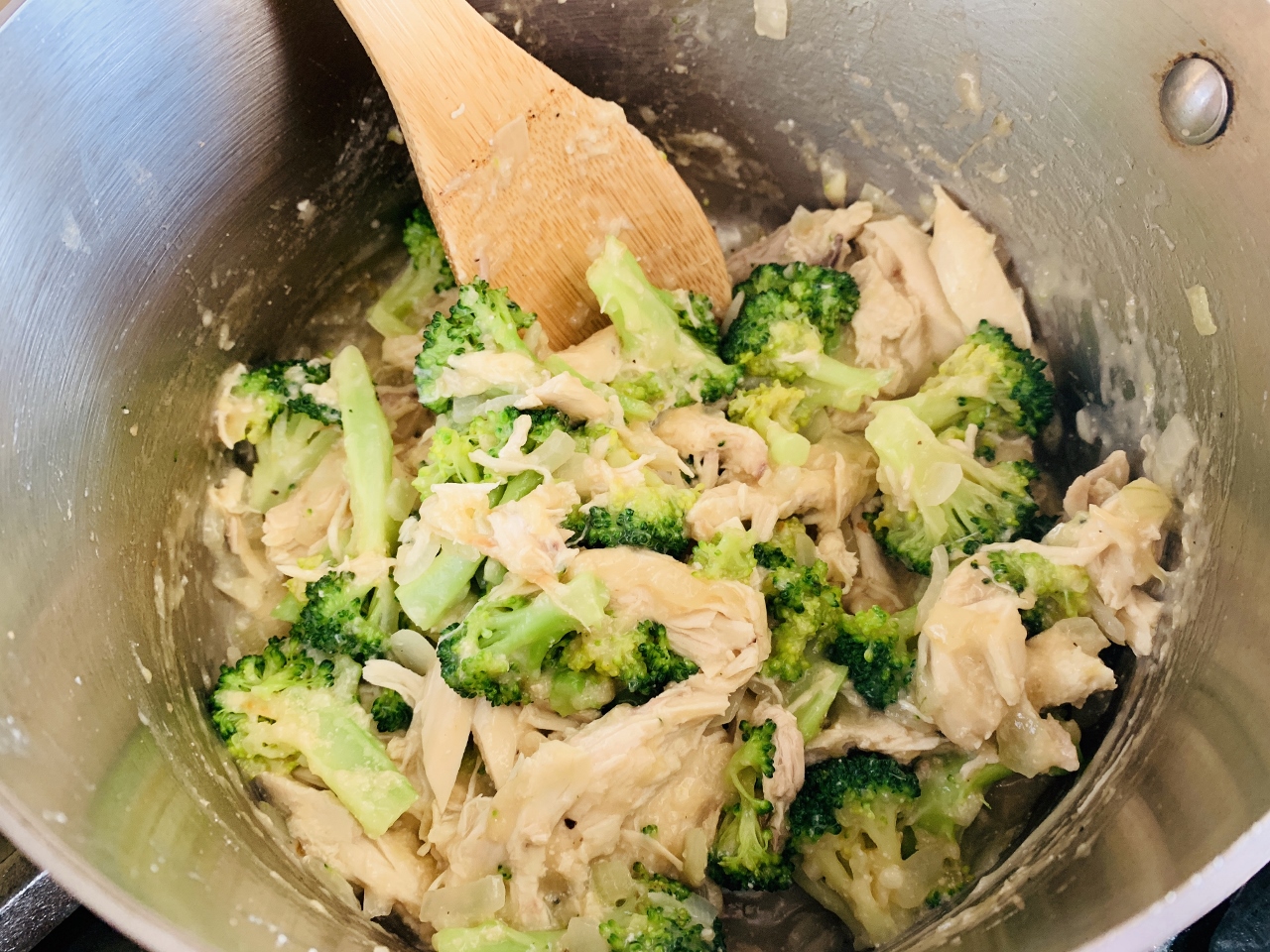 Whether you use rotisserie chicken from the grocery store or poached chicken breasts you prepare at home – shredding chicken is a simple process.  Adding this chicken into a light and creamy sauce is the next step, which is created by preparing a roux made with low-fat milk, flour and a tablespoon of butter.  This combination is stirred up in a saute pan, along with steamed broccoli and an onion, then stuffed into bell peppers and baked in the oven.