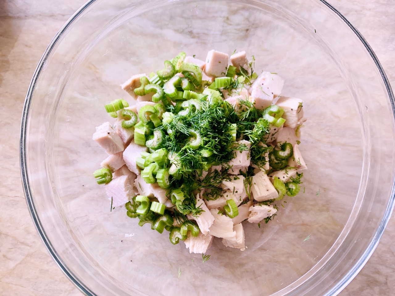 2. In a separate small bowl, whisk together sour cream, mayonnaise, dill and mustard.  Add salt and pepper and stir.