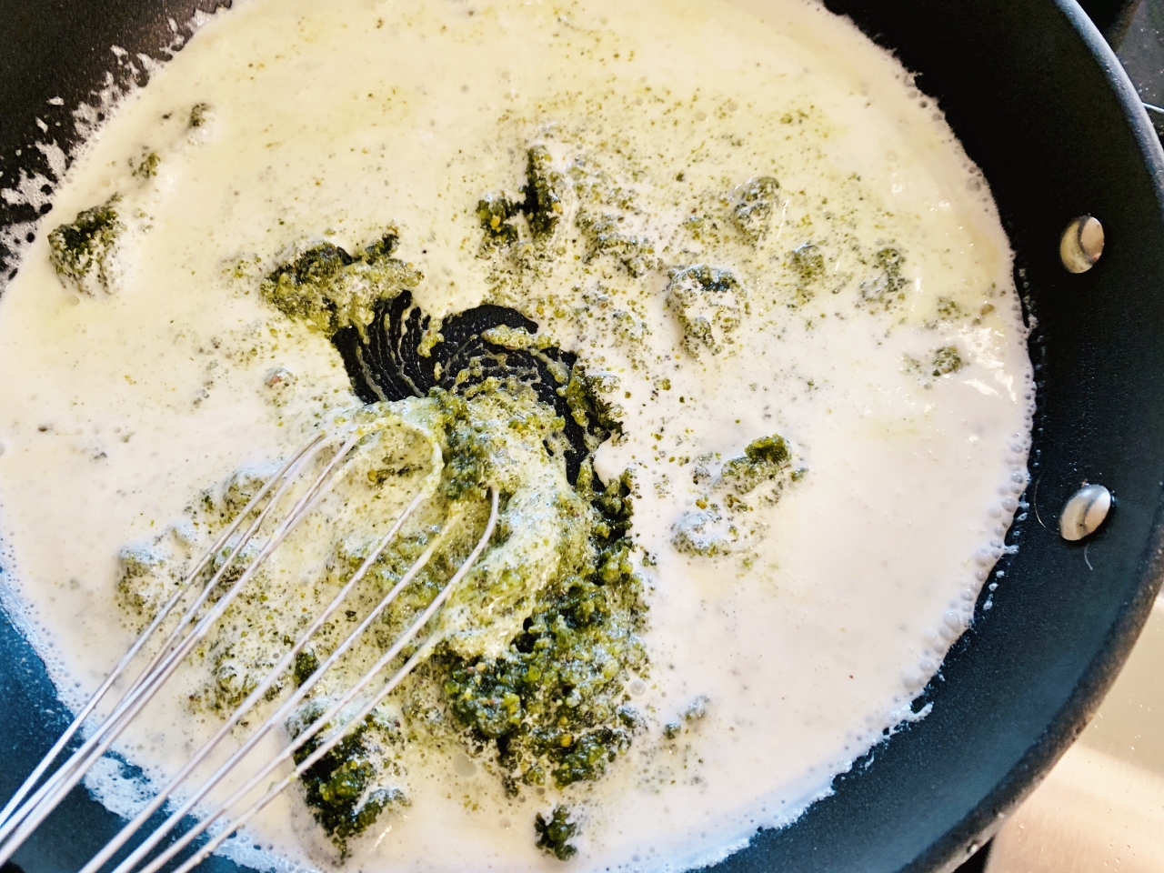 Creamy pesto is basically adding fresh pesto sauce into a bit of heavy cream to make one of the most luscious sauces out there.  What makes this sauce so delightful is that it’s decadent, luscious and flat-out delicious, and if you want your meal to really appeal to the eaters in your household, this sauce is the way to go.