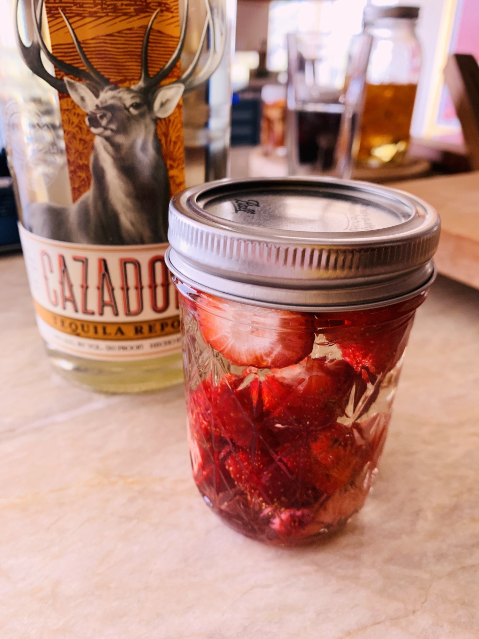 1. Add strawberries to a mason jar with fitted lid and fill with reposado tequila.  Let hang out on countertop for several days, at least 2 days.