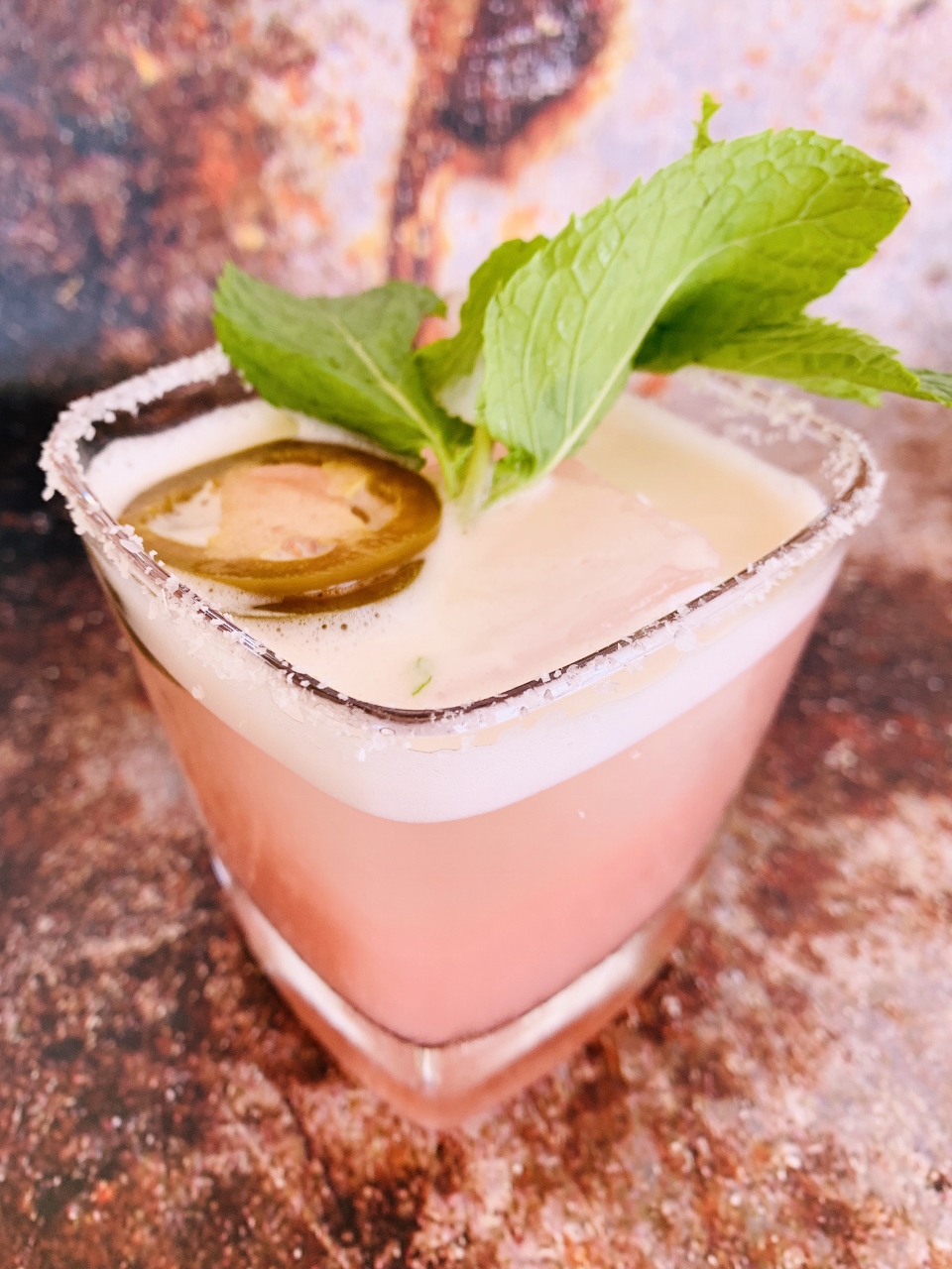 5. Place 1 large cube of ice or several smaller cubes of ice into two glasses.  Strain margaritas over ice.  Place one jalapeno slice from jar and a few mint leaves on top of each glass.  Serve cold.  Enjoy!