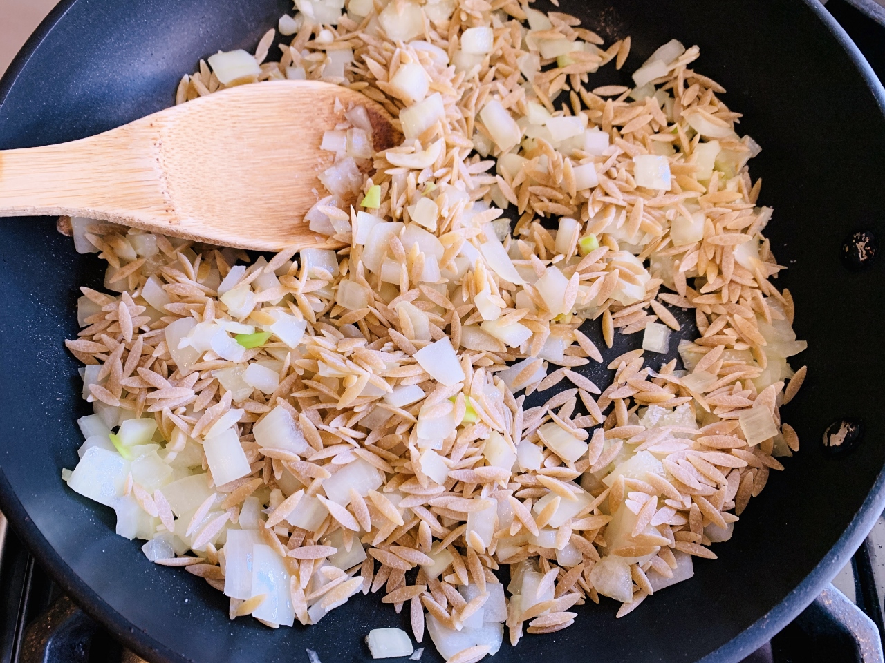 2. Place lid on top of pan for 2 minutes.  Remove and let orzo cook uncovered until reduced for 8-10 additional minutes, stir occasionally.
