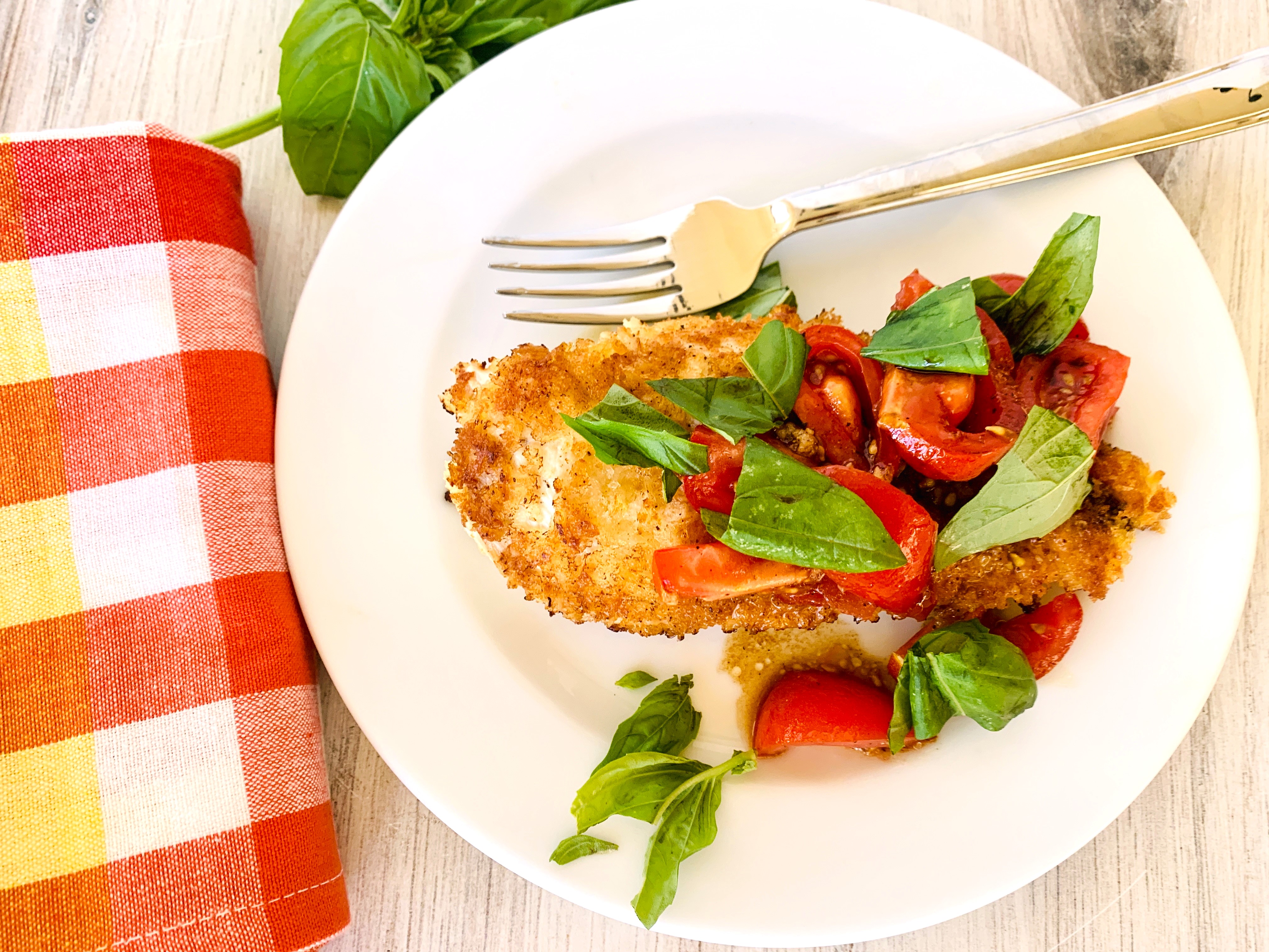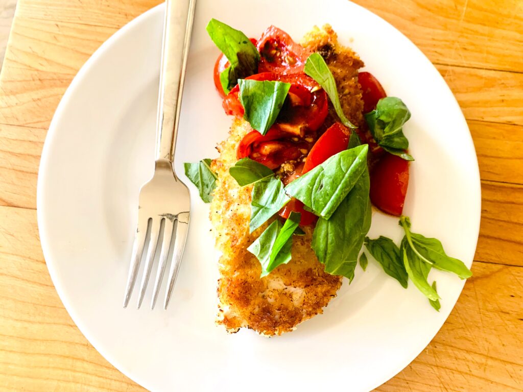Panko breadcrumbs can be found in most grocery stores or online, as well as gluten-free varieties. The coarse crumbs coat boneless chicken breasts with ease and a tip is to slice the chicken horizontally in half, so the meat is a thinner cut, no need for pounding. The chicken comes out crispy golden brown with the right tenderness inside because it’s not too thin, but just right. The tomatoes and basil are marinated quickly by soaking up some good balsamic vinegar and olive oil in a bowl. Spoon it over the crunchy golden chicken and dinner is served.