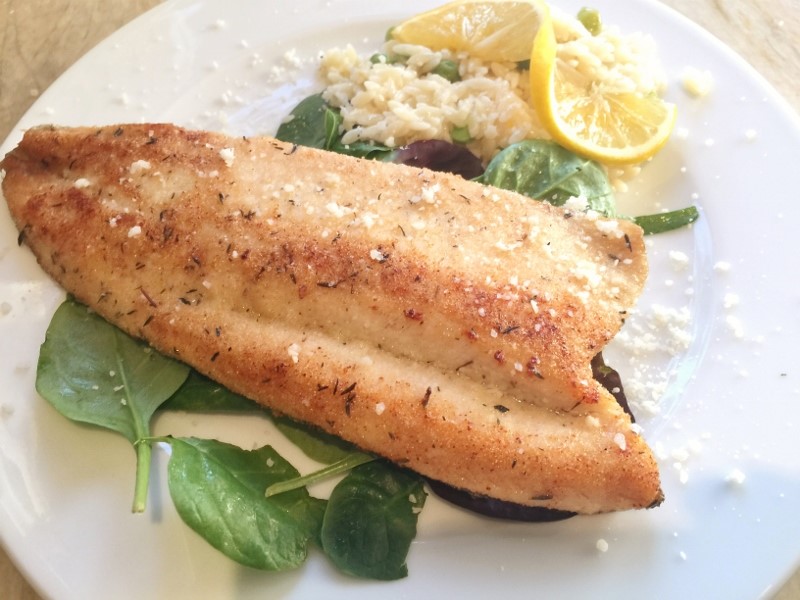 4. Drizzle 2 teaspoons of vegetable oil in a saute pan and place over medium heat. After 3 minutes, add trout, flesh side down. Cook trout for 3 minutes, or until lightly crispy, flip over. Turn heat to low and cook trout another 3-4 minutes, or until crispy skin. To plate – take a handful of mixed greens and place on plate, layer with a piece of crispy trout and spoon a dollop of orzo on side. Serve with a lemon wedge to squeeze over fish and orzo. Enjoy!