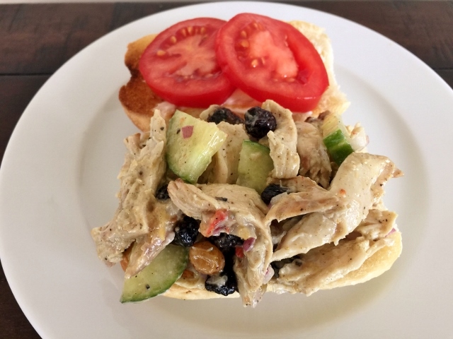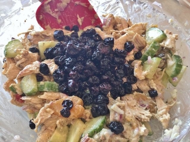 3. Add blueberries into hot water for 5 minutes to re-hydrate. Shred chicken into bite sized pieces and place in the bowl with curry dressing. Add diced onion and chopped cucumbers to bowl, and stir to combine.