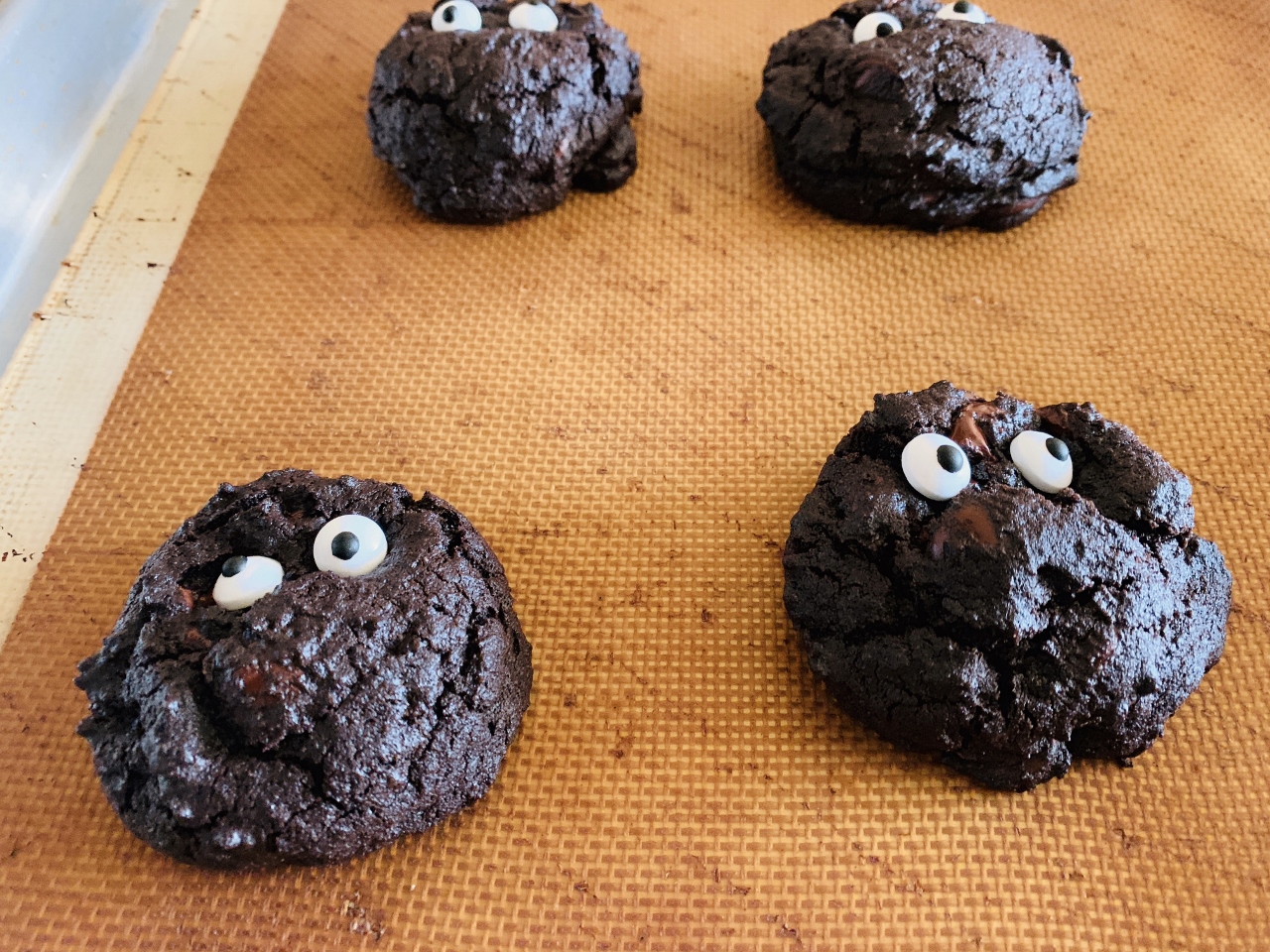 5. Bake cookies in oven for 12-14 minutes, or until slightly puffed.  Remove and let cool 2 minutes before lightly pressing eyeballs on top.  Continue to cool cookies on sheet pan for 5 minutes.  Place on wire rack until room temperature.  Enjoy!