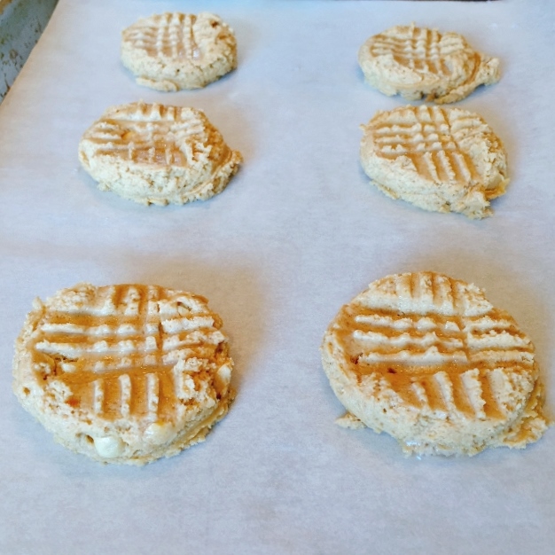 3. Scoop dough out onto a parchment lined cookie sheet and using a fork, make a crisscross pattern on top of each cookie. Dip fork into water in between cookies.