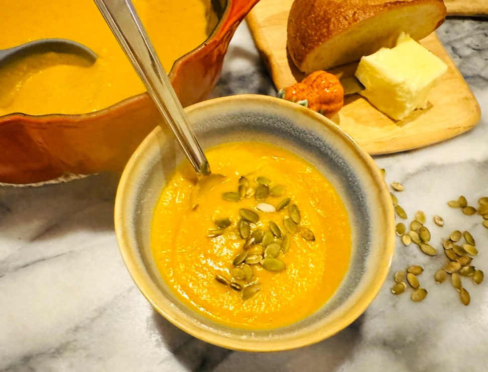 I ladled the soup into bowls and topped it with some crunchy pepitas. A slice of rustic bread would be outstanding served alongside.