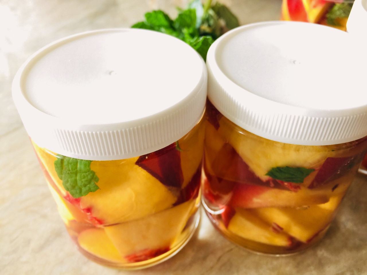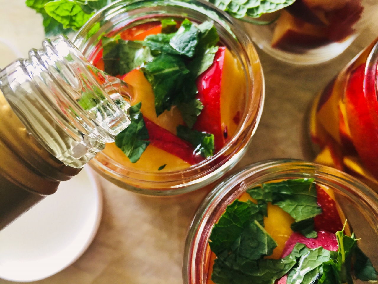 Using a jar with fitted lid for individual portions is a fun presentation, also it makes it easy to port to dinner parties, or picnics. Fill and chill the jars ahead of time, so the cool environment lasts through dinner and the nectarines have enough time to bathe.