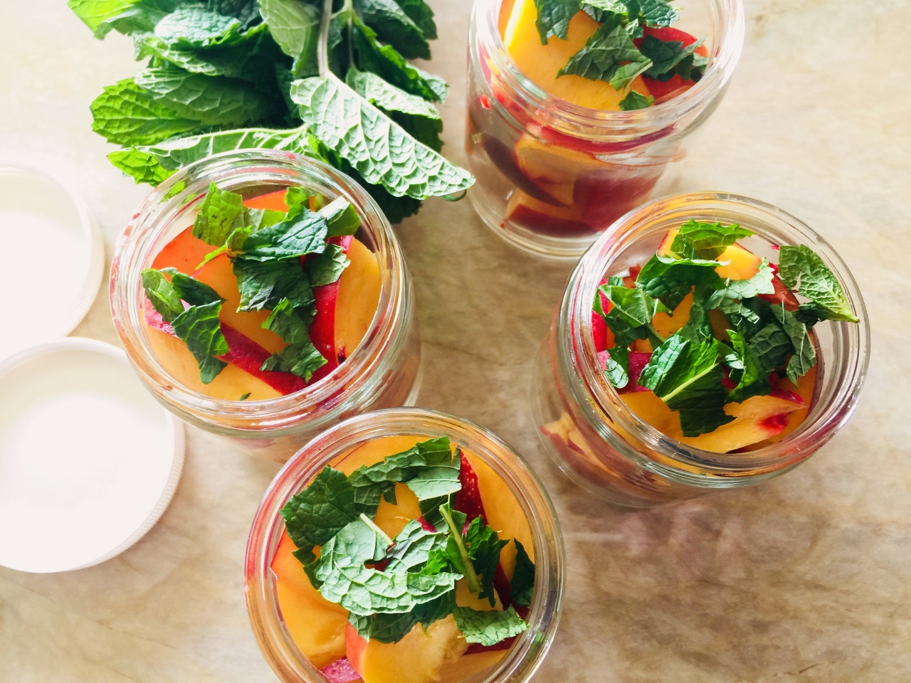 Using a jar with fitted lid for individual portions is a fun presentation, also it makes it easy to port to dinner parties, or picnics. Fill and chill the jars ahead of time, so the cool environment lasts through dinner and the nectarines have enough time to bathe.