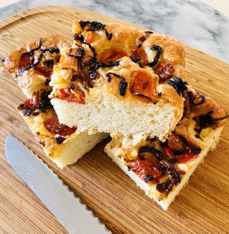 Make delicious Easy Homemade Focaccia —a fluffy, golden bread topped with shallots, juicy tomatoes.