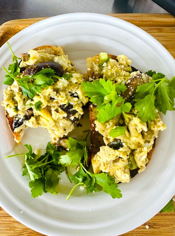Whether you are looking for a delicious way to start the day or celebrate Easter, or any other holiday brunch, these Easy Scrambled Egg and Mushroom Toasts are incredibly easy and quite tasty.  Scrambling a few eggs and whites, like in the recipe, create the most fluffy eggs, and create a savory backdrop for sauteed mushrooms.