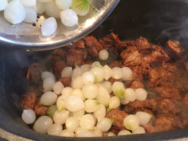 2. Sprinkle arrowroot over last batch of meat, while it is still cooking and stir. Cook for 2 minutes to remove any raw flavor. Add back all of seared meat and drained pearl onions. Add beef broth and 1 cup of water to meat and stir to combine.