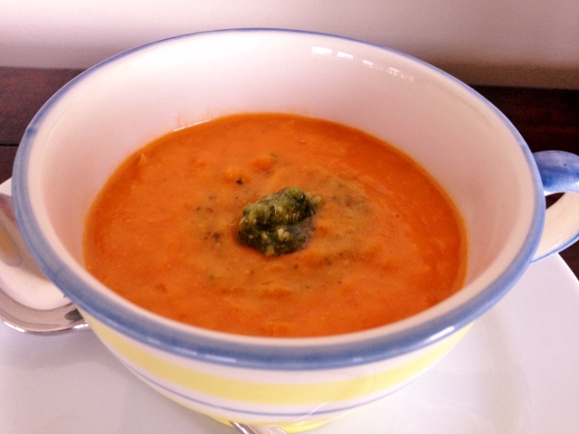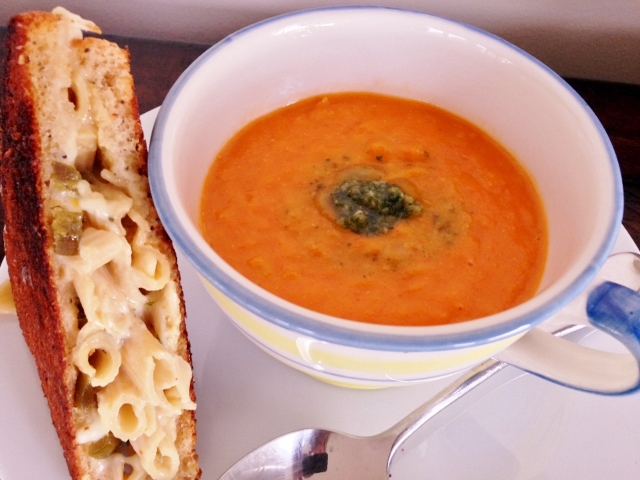4. Ladle soup into bowls and dollop with pesto for added flavor and a touch of color. Tomato Leek Soup is nice with my Mac & Cheese Grilled Cheese Sandwich recipe. Enjoy!