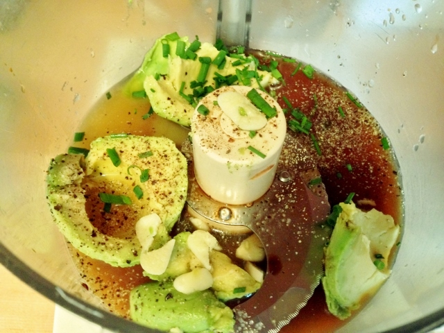 1.  In a food processor combine lemon juice, tamari, avocado, chives, 1/2 teaspoon salt, 1/2 teaspoon pepper and 1/2 garlic clove.  Blend for 2 minutes or until smooth.