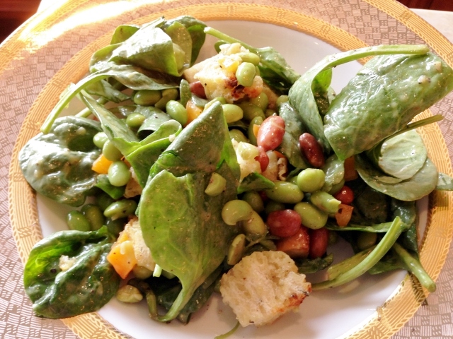 5.  Spoon edamame over spinach leaves and toss together.  Salt and pepper to taste and top with a few croutons, Enjoy!
