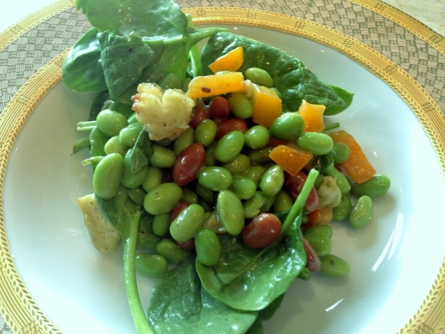 Edamame are available fresh or frozen and already shelled, which makes them easy to toss into salads. Adding a few other ingredients along with the edamame like; fresh baby spinach, pinto beans and freshly diced sweet and spicy peppers creates not only a delicious, but colorful bowl of enjoyment, sort of a carnival of healthy fun.