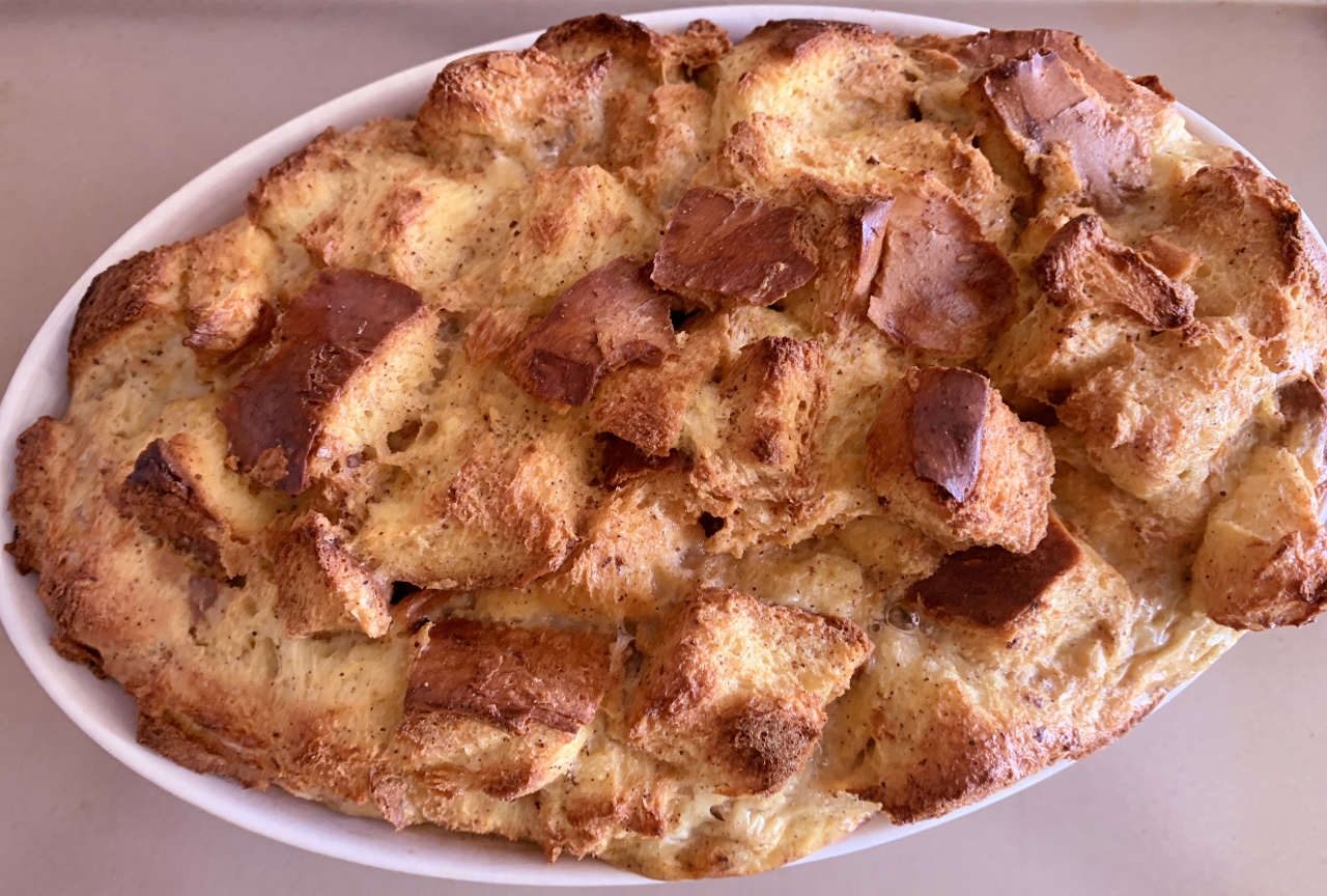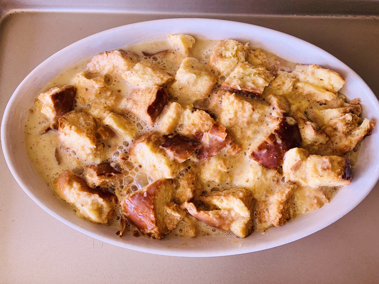 - Add toasted bread to custard and stir. Allow bread to rest in custard for 20 minutes.