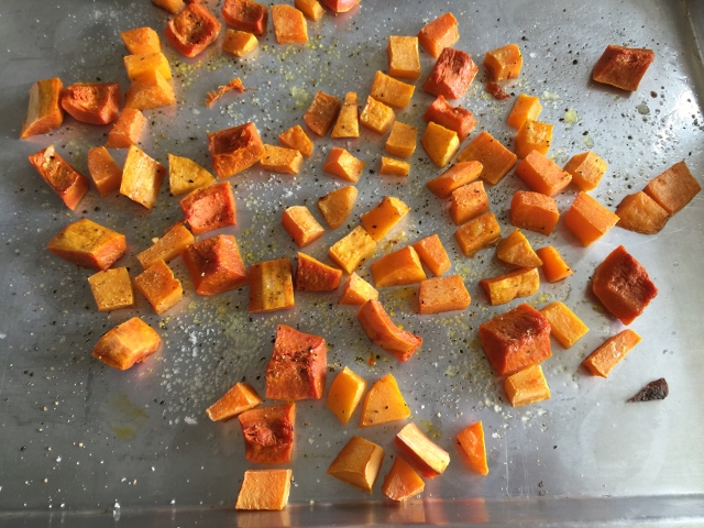 1. Preheat oven to 400 degrees.  Place diced squash on a sheet pan and drizzle with 1 tablespoon olive oil, toss.  Sprinkle squash with salt and pepper.  Bake for 25-30 minutes or until fork tender, remove and let cool.