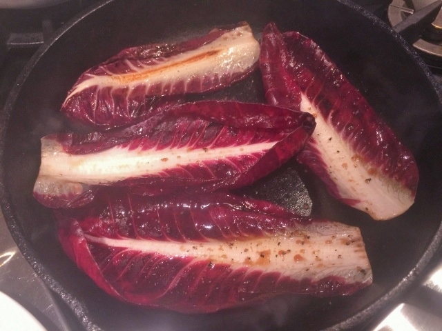 4. After 30 minutes, remove radicchio from marinade and sear in a hot cast iron skillet, until slightly wilted and edges charred, about 2 minutes per side.  Remove and let cool.