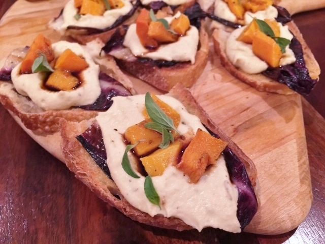 5. Toast bread on a sheet pan under broiler.  To layer – start with 1 wilted radicchio leaf, then a dollop of chickpea puree, and top with roasted squash – repeat.  Sprinkle each Bruschetta with a few fresh herbs.  Enjoy!