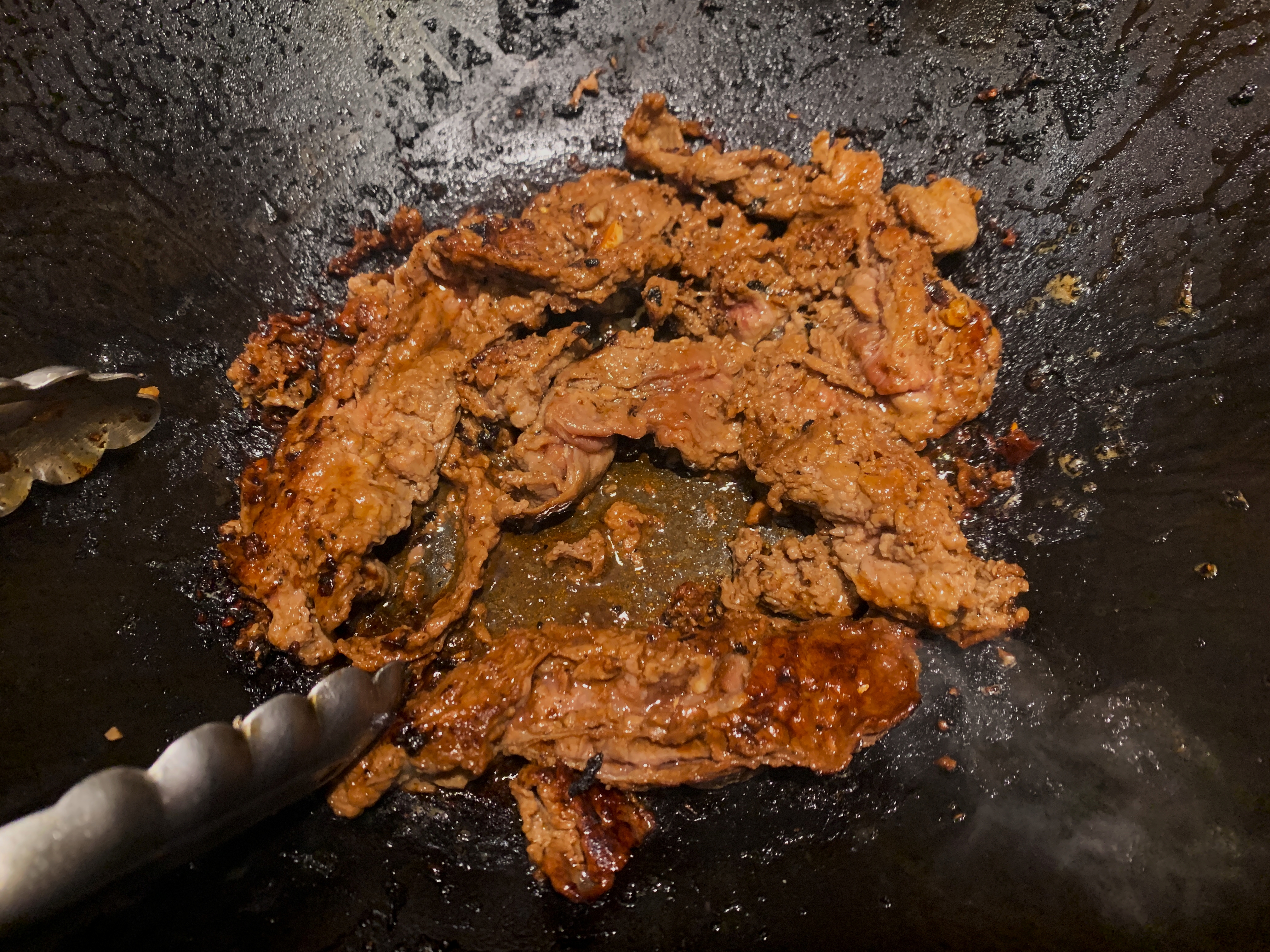 - Add broccoli and stir while cooking. Add soy sauce and chili oil (add less if you don’t want too spicy). Continue to cook for 3 minutes, tossing vegetables together. Add seared beef and stir.