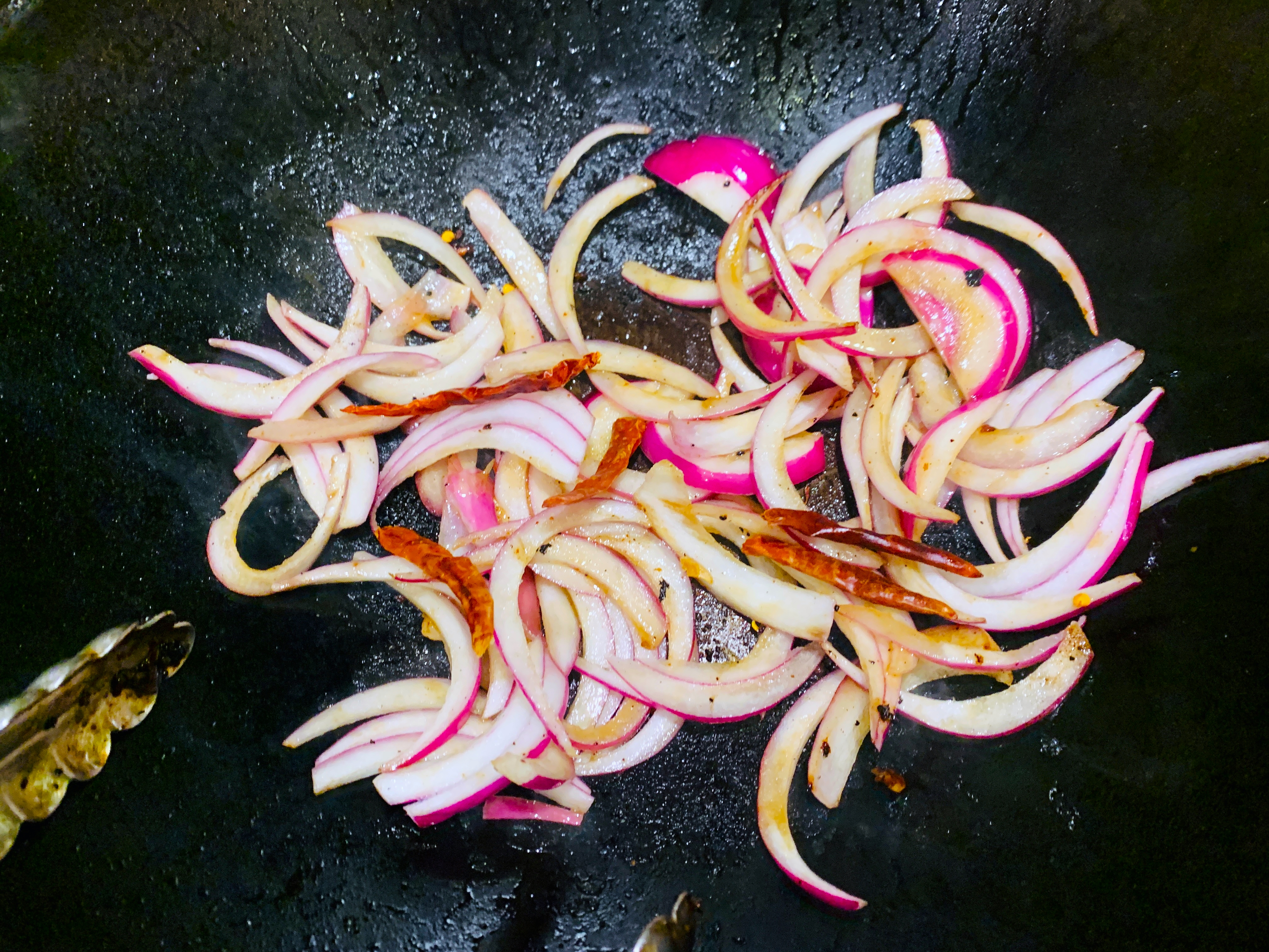 - Add 1 tablespoon oil to wok and add onion, stir continuously until softened slightly, about 3 minutes. Add chilies, as many as you think you can handle (I used 6), less if you don’t want it too hot. Add mushrooms and cook for 2 minutes, while stirring occasionally.