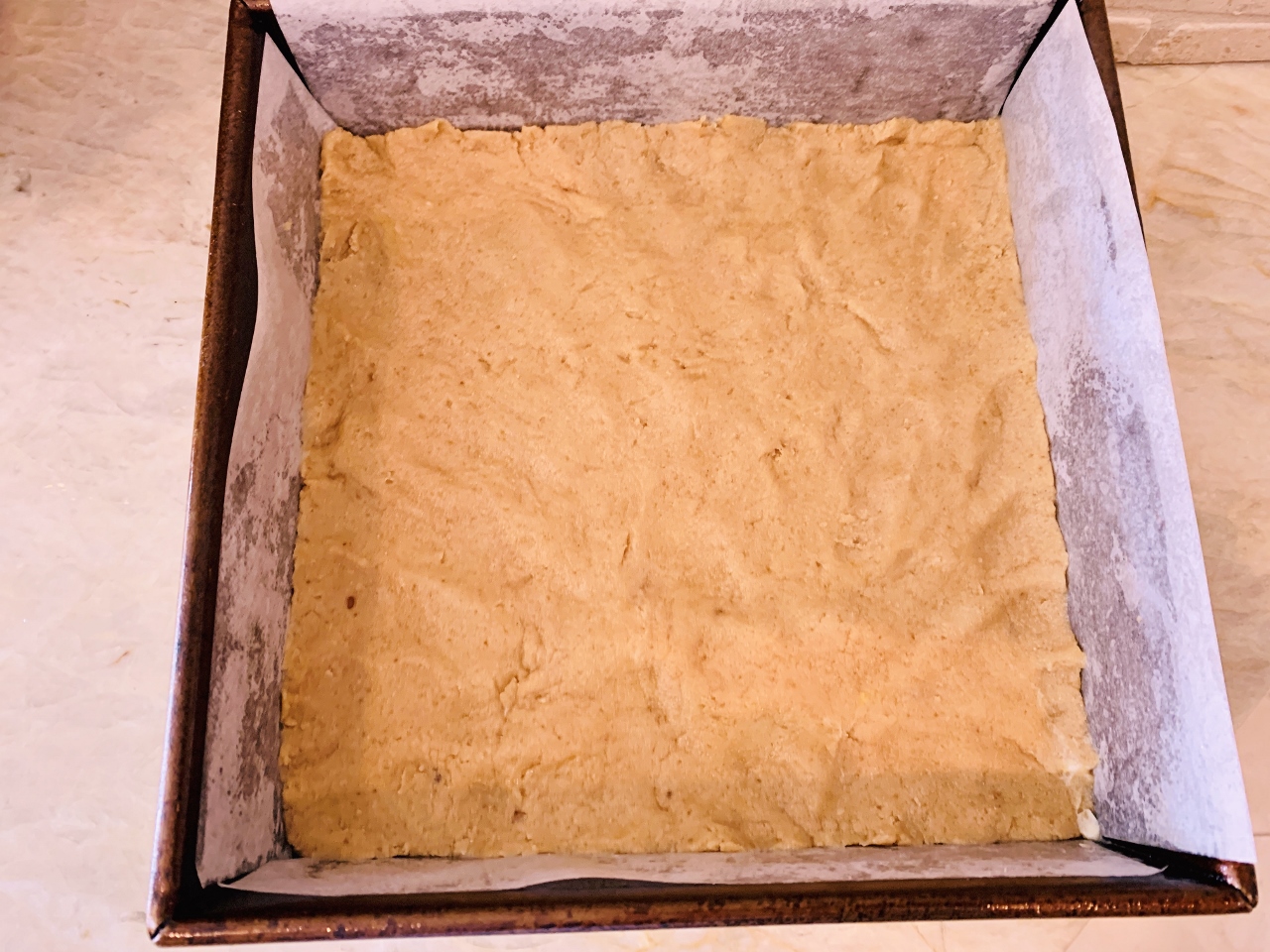 4. Place 2/3 of dough into prepared pan and press dough into bottom to form a crust.  Bake for 12 minutes, just until lightly puffed.  Remove and let cool for 5 minutes.