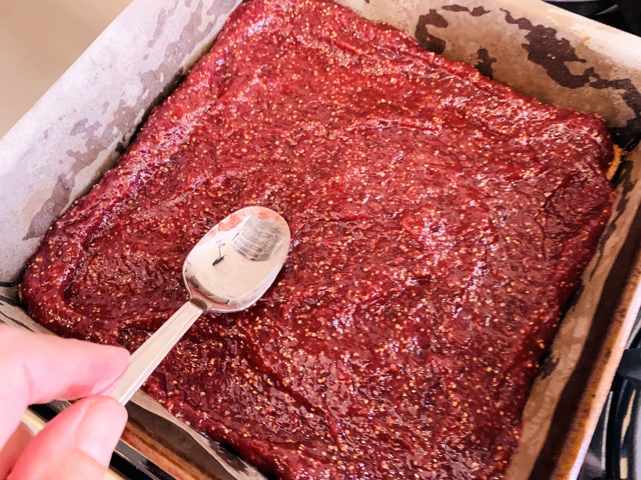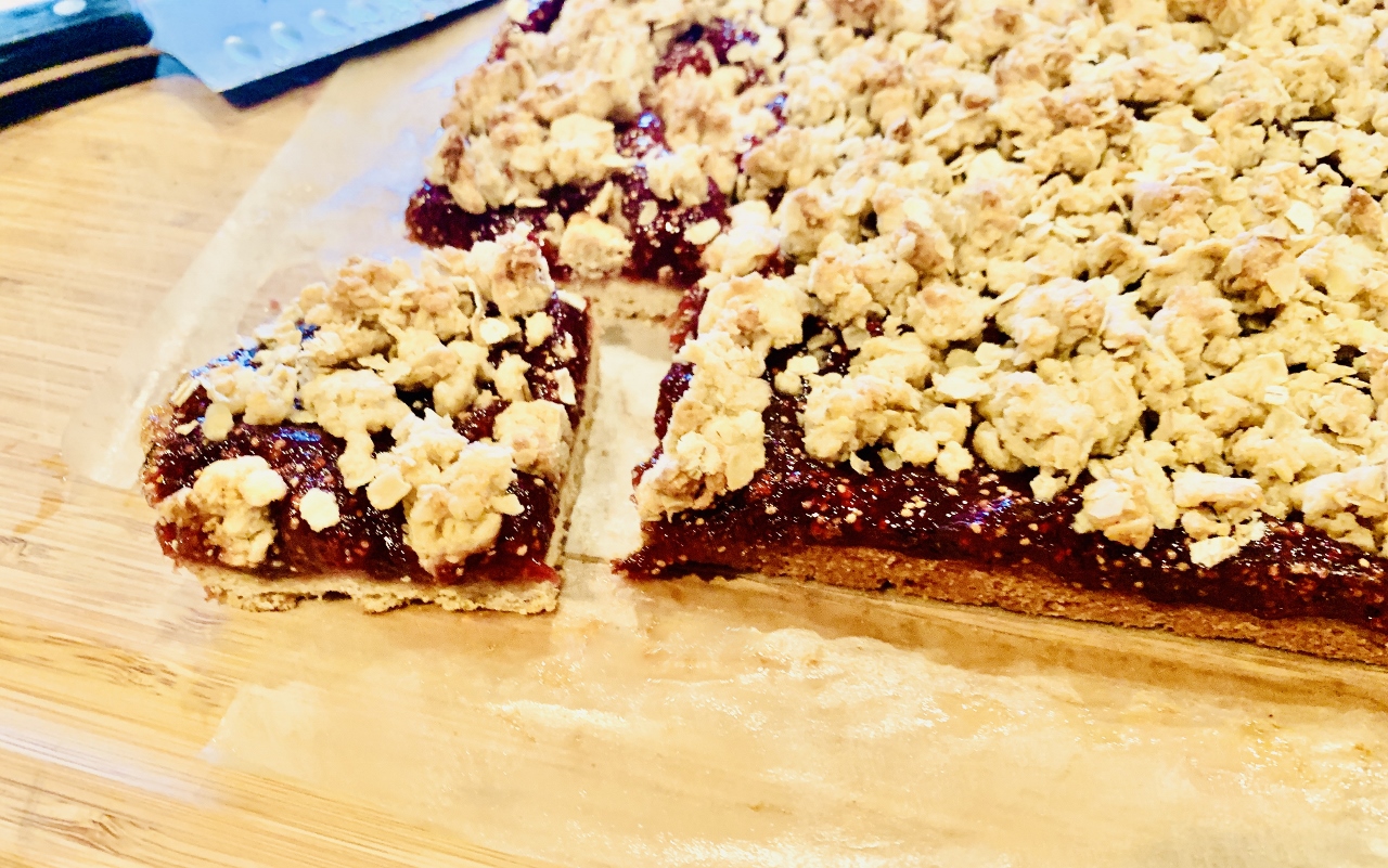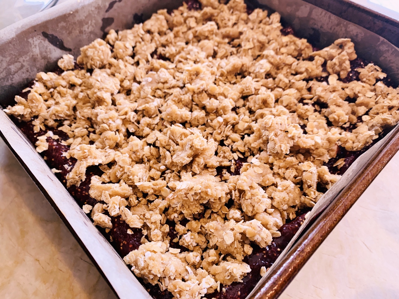5. Add oatmeal to remaining dough and press together to form coarse crumbs, set aside.  Add jam on top of baked crust, spread out evenly.  Sprinkle jam with crumbs and bake in oven for 18-20 minutes, or until lightly golden brown.  Remove and let cool completely before slicing.  You can store in refrigerator for easier slicing, or to serve later.  Enjoy!