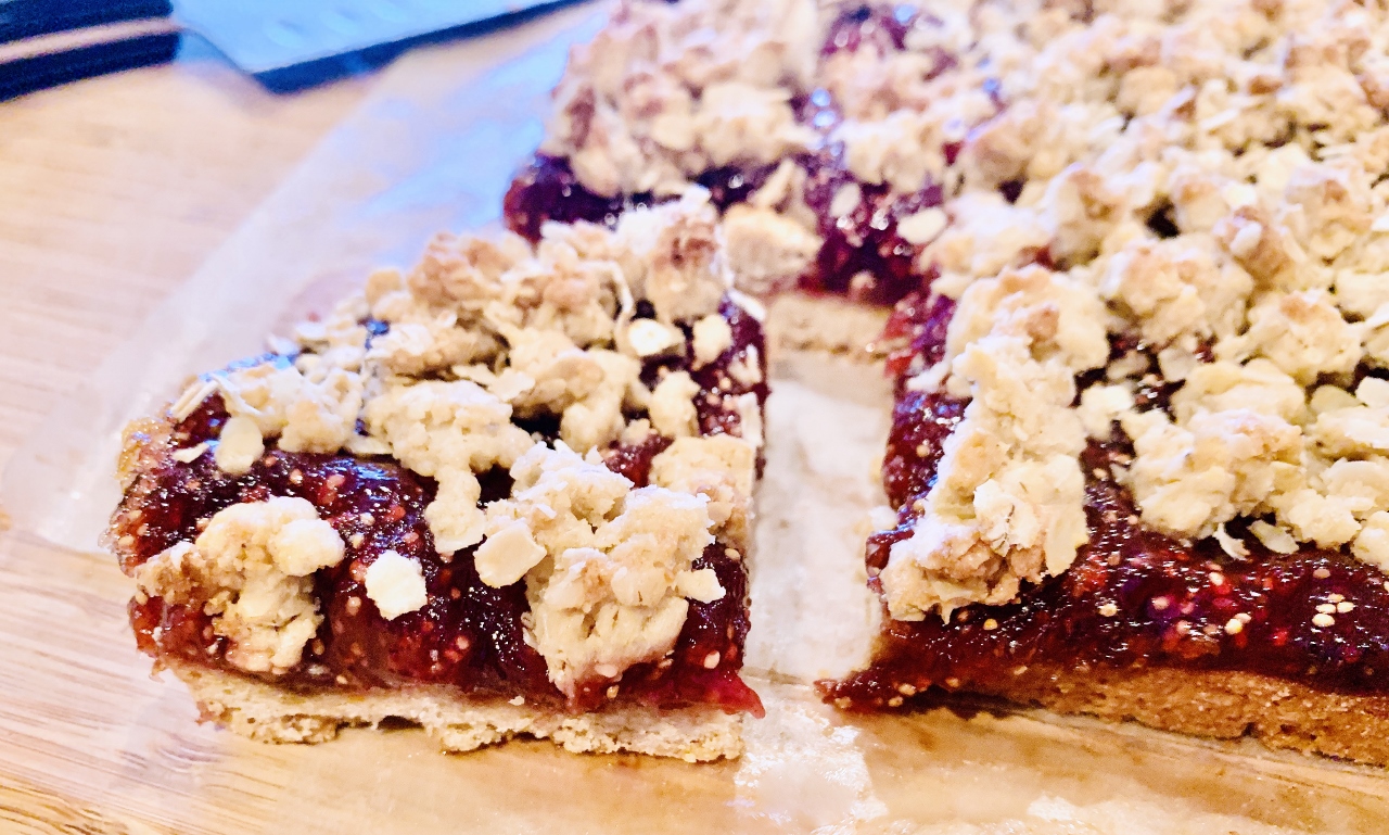 5. Add oatmeal to remaining dough and press together to form coarse crumbs, set aside.  Add jam on top of baked crust, spread out evenly.  Sprinkle jam with crumbs and bake in oven for 18-20 minutes, or until lightly golden brown.  Remove and let cool completely before slicing.  You can store in refrigerator for easier slicing, or to serve later.  Enjoy!