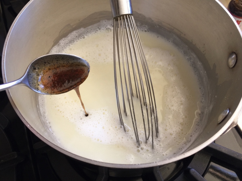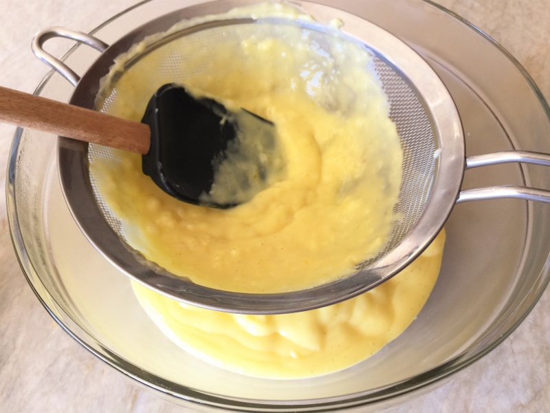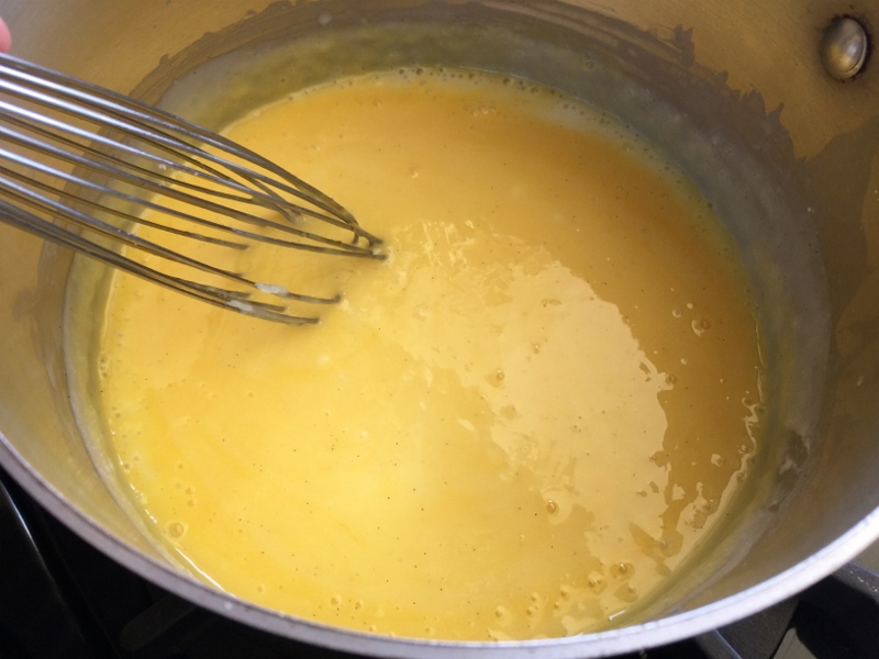 2. In a saucepan, add milk, cream, sugar, cornstarch, vanilla bean paste and salt whisk to combine. Place over medium heat and cook until simmering. Whisk egg yolks together and add 2 tablespoon of hot milk, whisk. Drizzle the warmed eggs into the saucepan of hot milk and whisk until thickened, about 3 minutes.