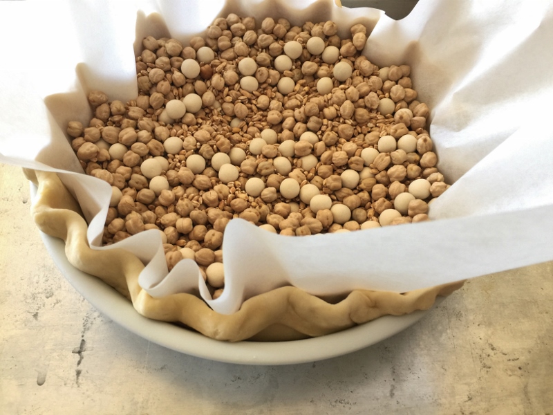 1. Preheat oven to 375 degrees. In a stand mixer or large bowl, combine flour, sugar and salt. While the mixer is running on low, add the butter and shortening, mix until coarse crumbs. Pour in ice water and mix until dough just begins to come together. Place dough onto plastic wrap and form into a disc, wrap tightly. Refrigerate for 30 minutes. Remove dough and roll out onto a lightly flour dusted counter. Place dough in pan and trim edges, then tuck edges under and crimp. Pierce bottom and sides with fork and place in freezer for 10 minutes. Put a piece of parchment in center of pan and add pie weights or dried beans. Bake for 15 minutes, remove parchment and weights and bake again for 15 minutes. Let cool.