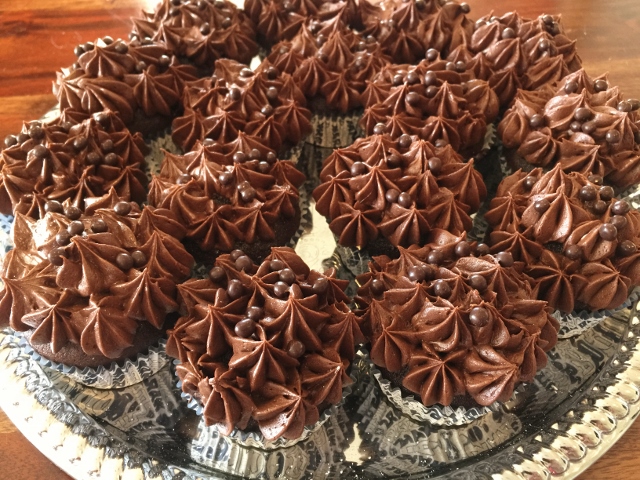I made these cupcakes a week ago for my grandson’s birthday and the whole group devoured them instantly — I had a few moms want me to take orders for them!  As for the frosting, super chocolaty and creamy with a nice smooth finish.  I sprinkled a few Valrhona chocolate pearls on top, but those are always optional.
