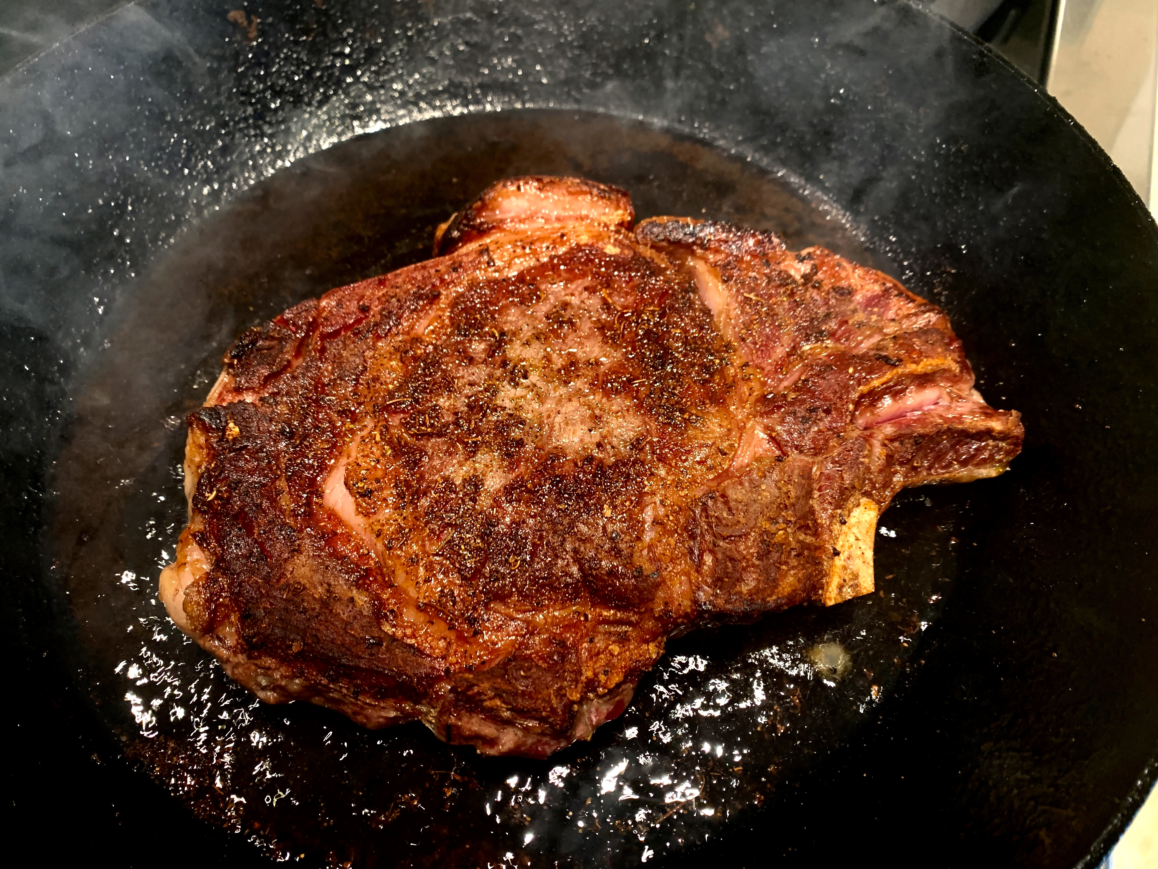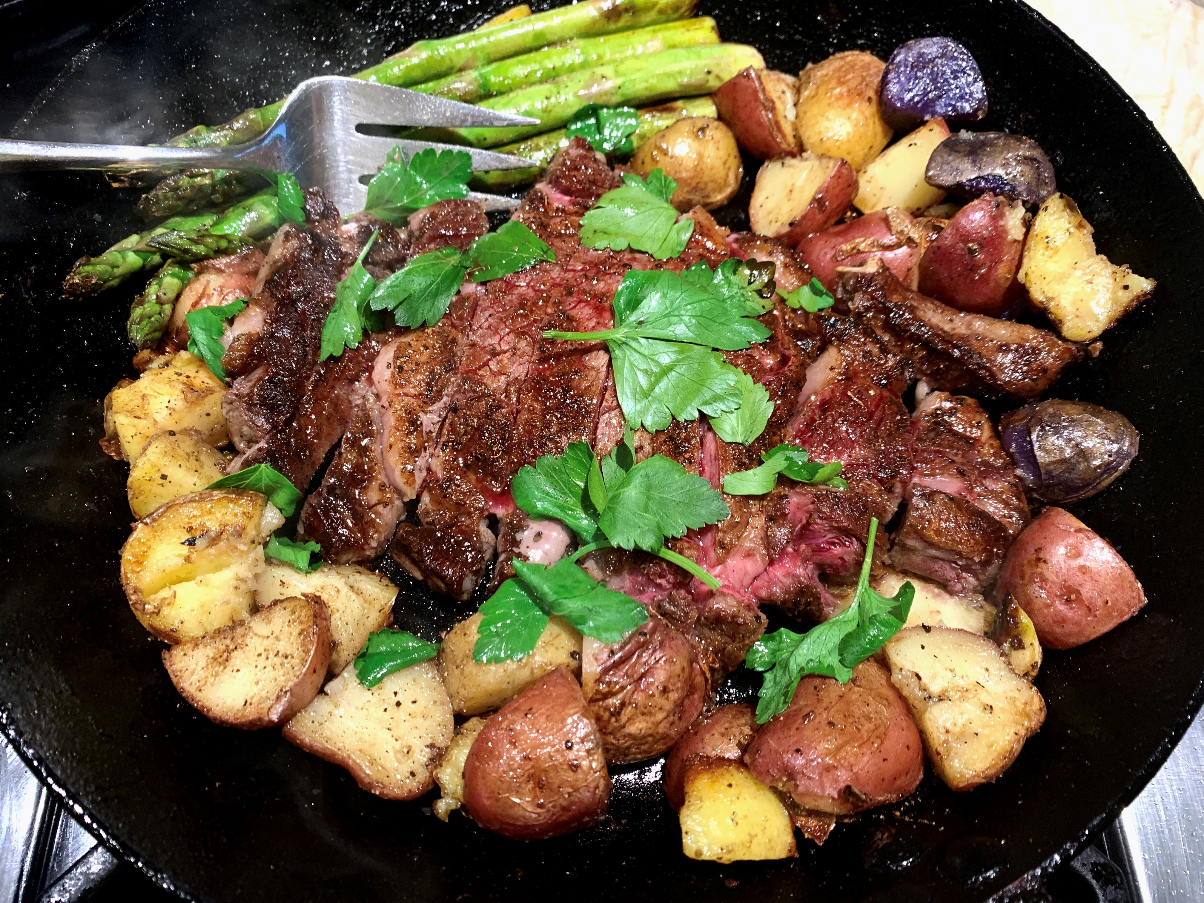 One pan meals are some of the best weeknight food because they are fast, yet fresh and tasty.  There’s no skimping on flavor here.  A good rib eye does need a little salt and pepper before it meets a hot skillet and another tip is to dust the beef with some fennel pollen, beforehand.  I learned this trick during my travels in Italy from a famous butcher named Dario Cecchini in Tuscany.   It’s definitely worth a trip to his butchery and restaurant, or at the least to watch some of his videos because he’s so entertaining and a great cook.   You can always skip this step because a good piece of meat speaks for itself, but I think the fennel pollen builds on flavor.