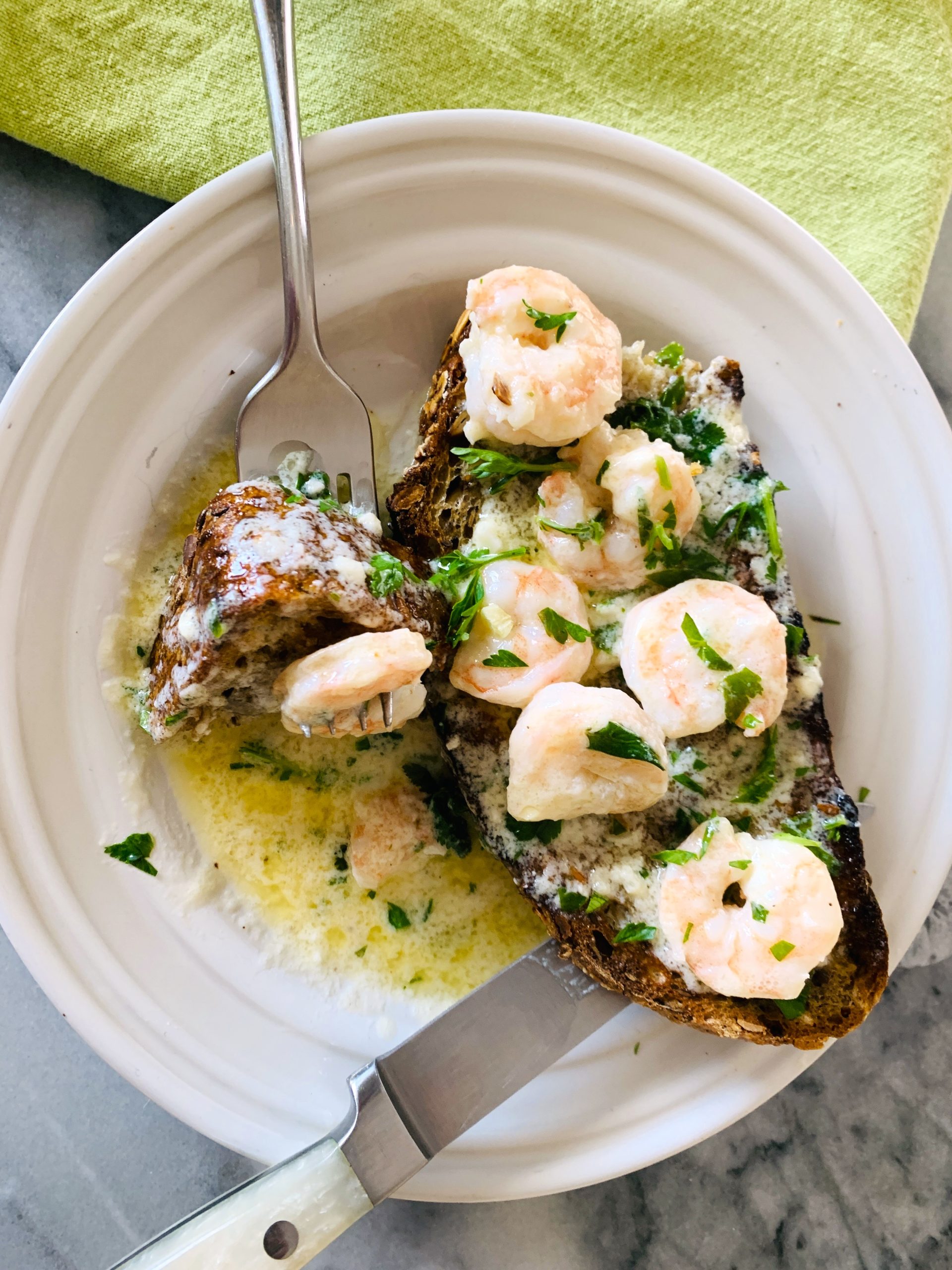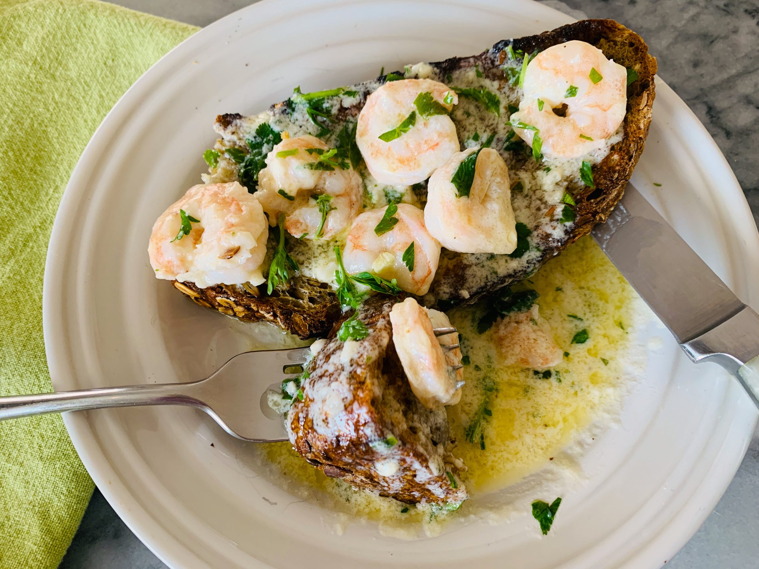 I love a good toast for breakfast, lunch or dinner — the perfect anytime meal. Buttery shrimp are cooked with a clove of garlic and some lemon juice, before the mascarpone cheese is added to the pan. It’s stirred gently until creamy and incorporated into the sauce. Fresh herbs and some white cheddar cheese are nicely combined for finishing flavor that’s so darn good when spooned over crunchy bread.