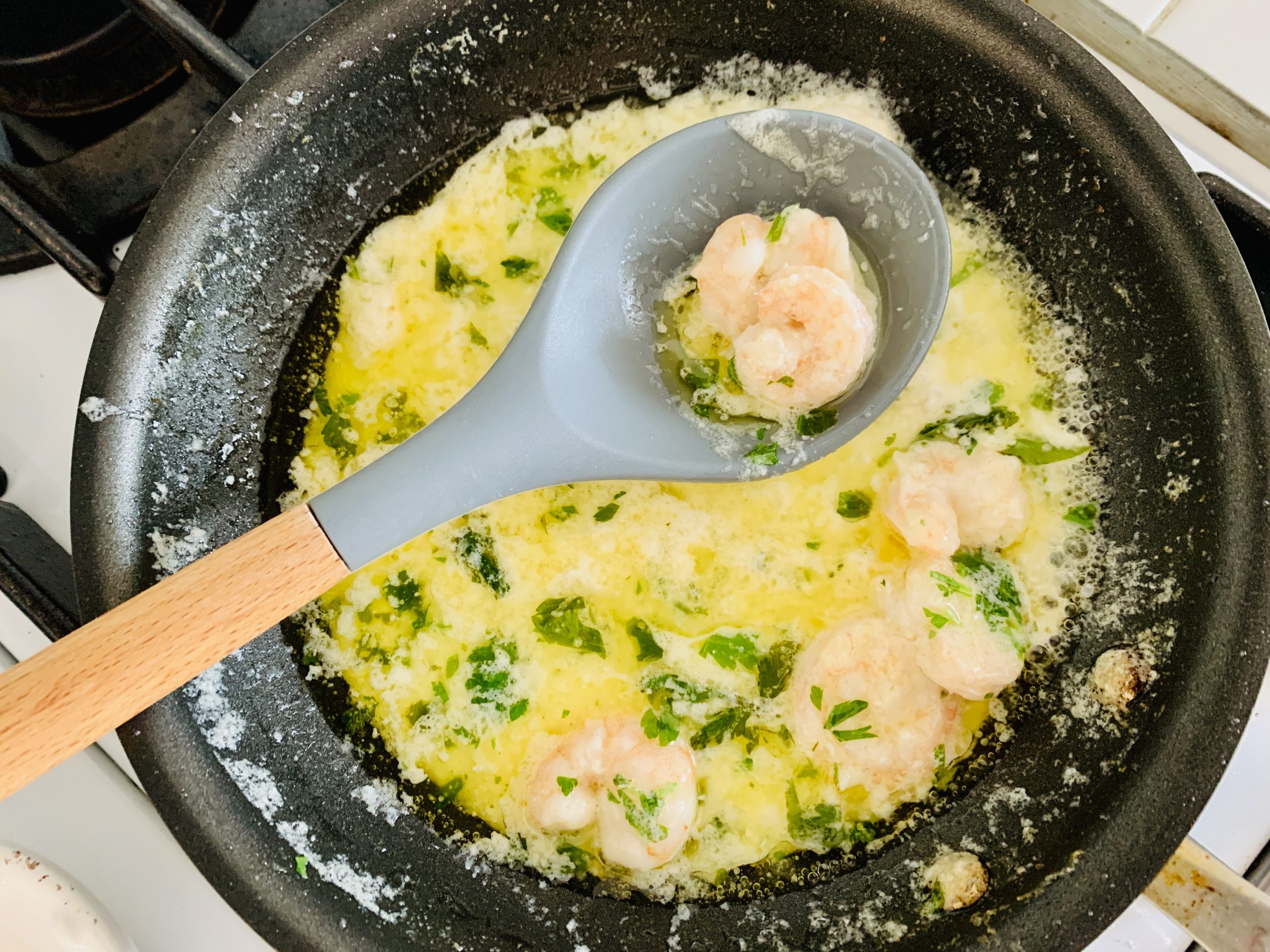 - In a sauté pan add butter and place over medium heat. Add shrimp and cook for 2 minutes. Add garlic, lemon juice, 1/2 teaspoon salt and 1/8 teaspoon pepper, continue to cook for 1 minute.
