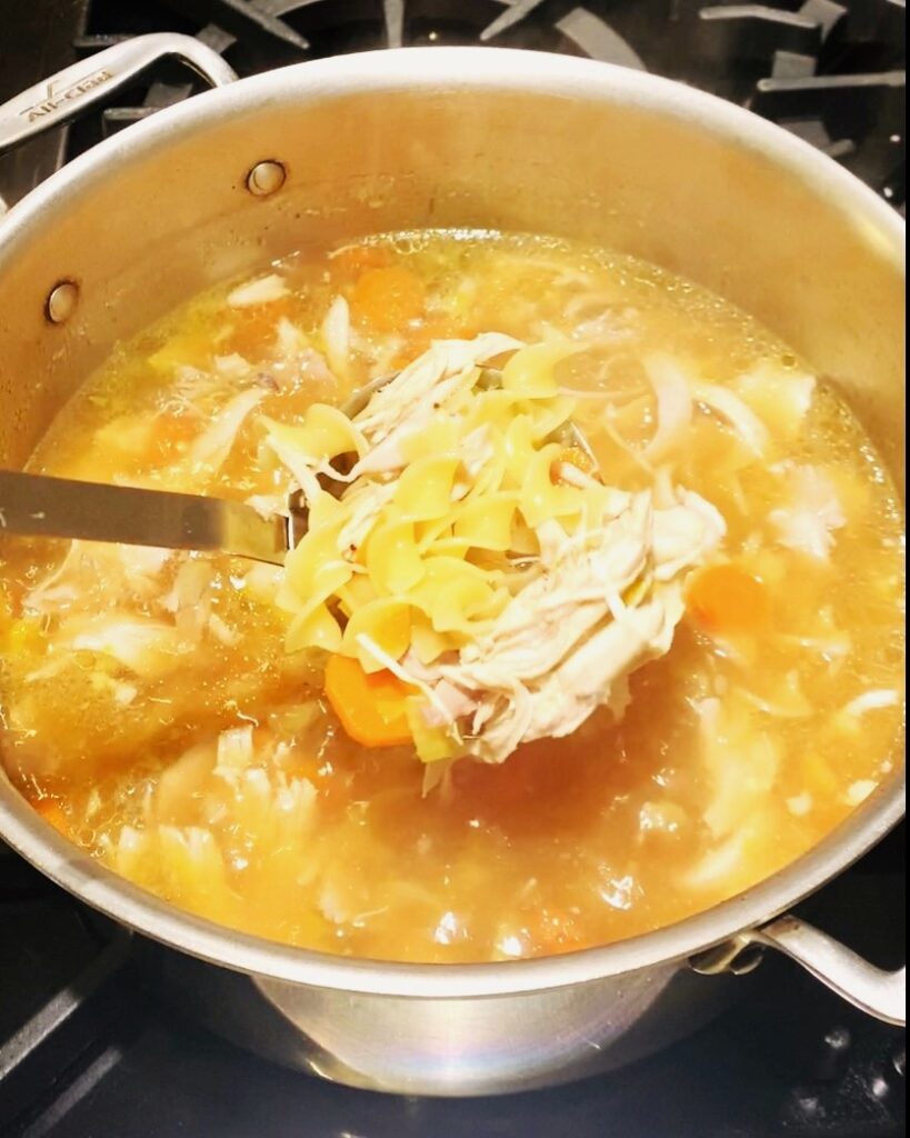- Add shredded chicken back into broth and egg noodles. Boil for 9 minutes over medium-high heat until al dente.